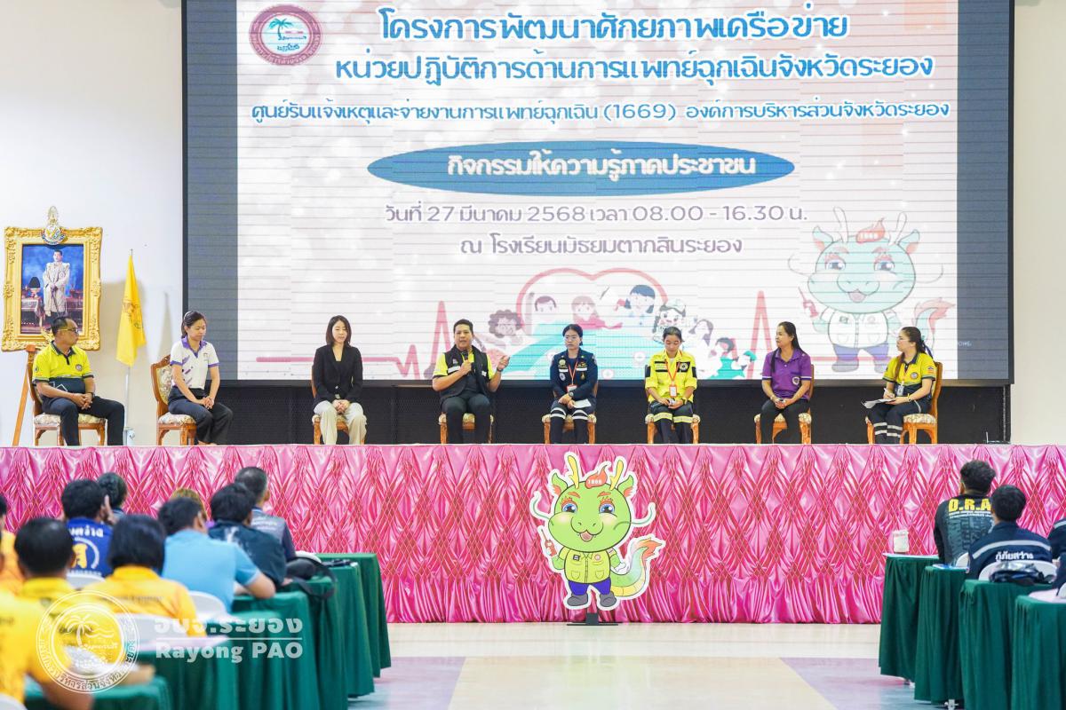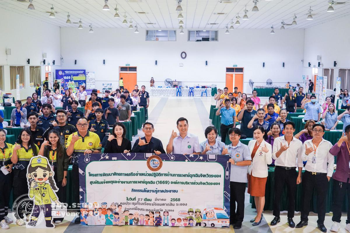 โครงการพัฒนาศักยภาพเครือข่ายหน่วยปฏิบัติงานด้านการแพทย์ฉุกเฉินจังหวัดระยอง ศูนย์รับแจ้งเหตุและจ่ายงานการแพทย์ฉุกเฉิน (1669) องค์การบริหารส่วนจังหวัดระยอง จัดขึ้นเพื่อเป็นการสร้างความรู้และความตระหนักด้านการแพทย์ฉุกเฉินจังหวัดระยอง ซึ่งจะส่งผลให้เกิดความเข้มแข็งของภาคีเครือข่าย ครอบคลุมทั้งภาครัฐ ภาคเอกชน และภาคประชาชน นำไปสู่การพัฒนาที่ยั่งยืน ภายในโครงการฯได้มีการบรรยายในหัวข้อ “การประเมินและคัดแยกผู้ป่วยฉุกเฉินกับภาวะฉุกเฉินที่พบบ่อยและการดูแลเบื้องต้น” เวทีเสวนาในหัวข้อ “เสียงสะท้อนการแพทย์ฉุกเฉินในปัจจุบันสู่อนาคตที่มุ่งหมาย” และกิจกรรมแบ่งกลุ่มเข้าฐานต่างๆ ณ หอประชุมโรงเรียนมัธยมตากสินระยอง อำเภอเมืองระยอง จังหวัดระยอง