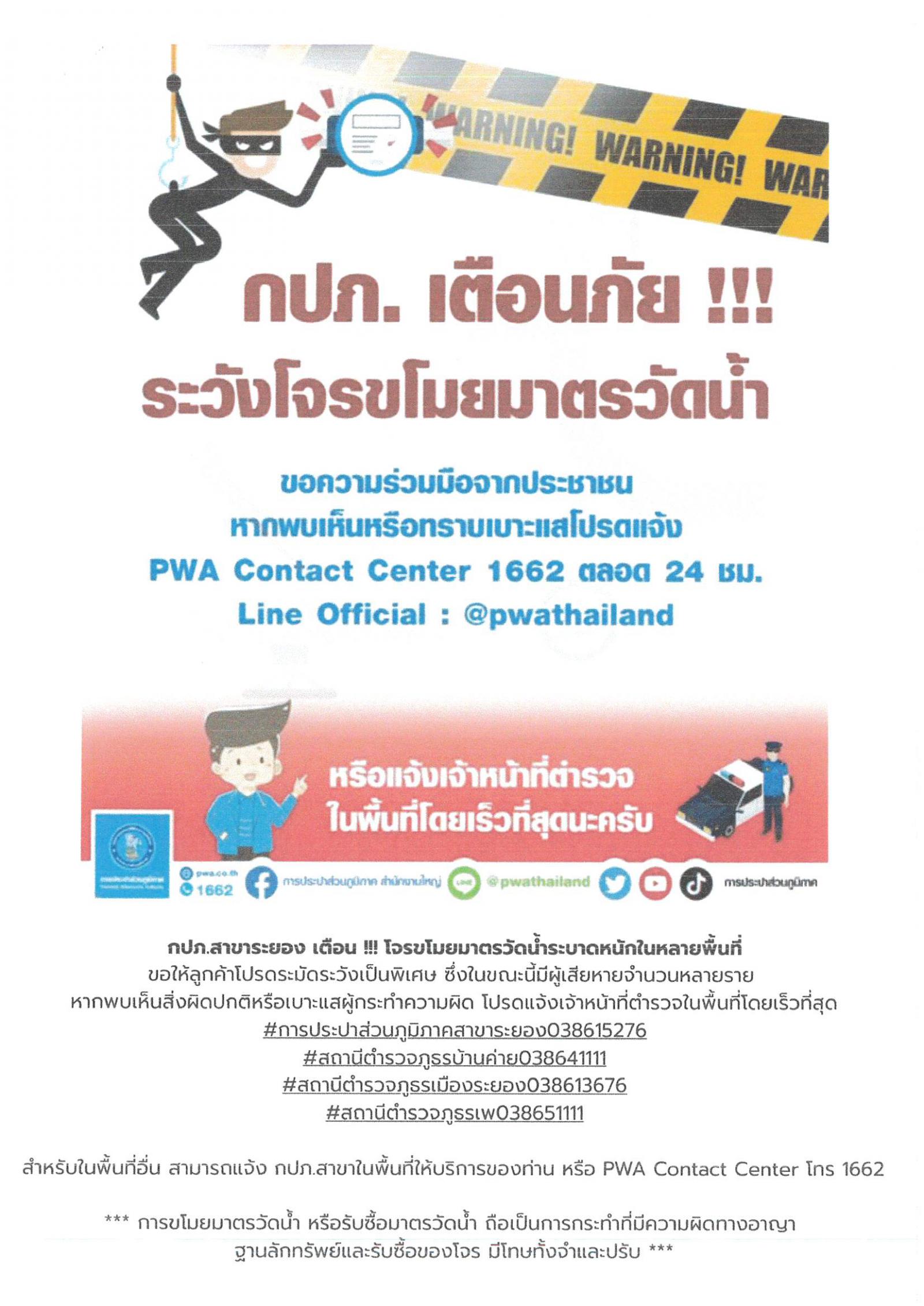 การประปาส่วนภูมิภาคจังหวัดระยอง เตือนภัย !!! ระวังโจรขโมยมาตรวัดน้ำ
