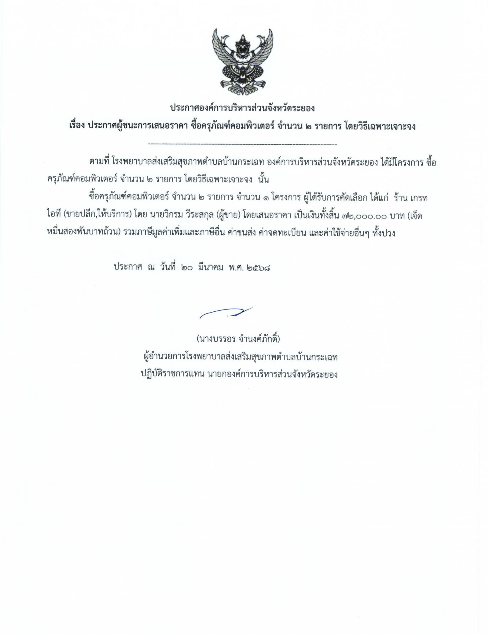 📌ประกาศผู้ชนะการเสนอราีคา จ้างเหมาจัดทำทำเนียบองค์การบริหารส่วนจัหวัดระยอง