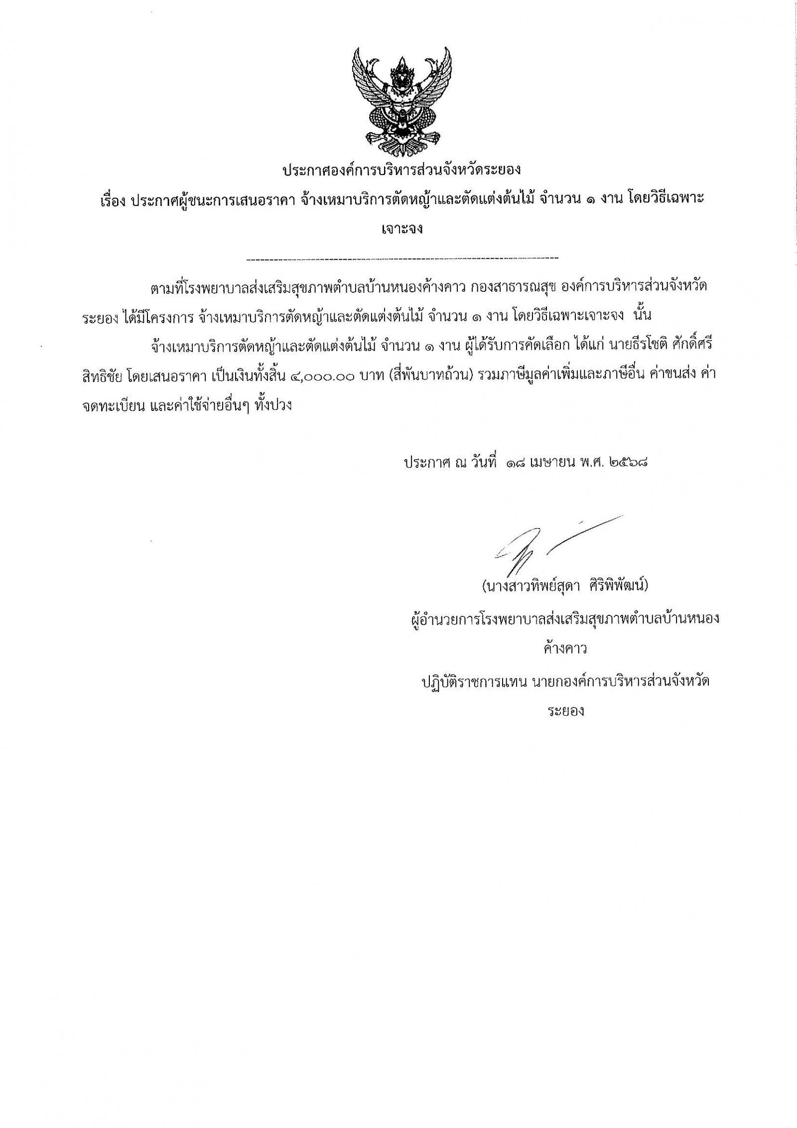ประกาศผู้ชนะการเสนอราคา จ้างเหมาบริการตัดหญ้าและตัดแต่งต้นไม้ จำนวน 1 งาน โดยวิธีเฉพาะเจาะจง