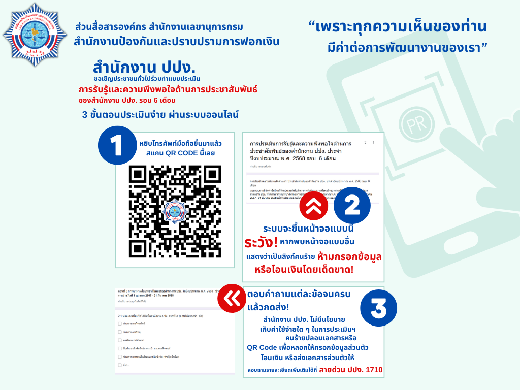 สำนักงานป้องกันและปราบปรามการฟอกเงิน เชิญชวนประชาชนร่วมประเมินการรับรู้และความพึงพอใจ.ผ่าน QR Code ของสำนักงาน ปปง