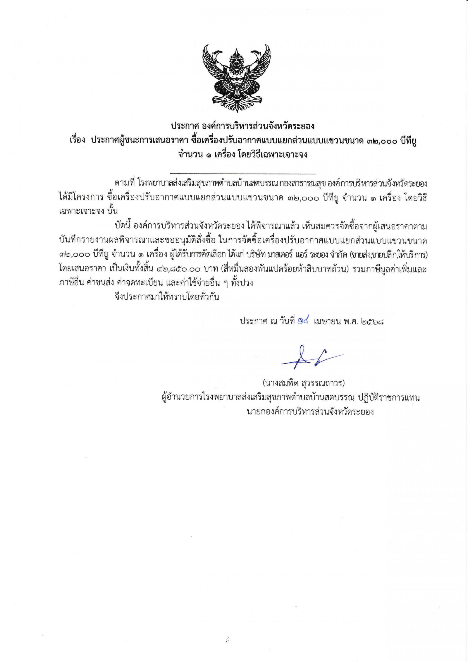 ประกาศผู้ชนะการเสนอราคา ซื้อเครื่องปรับอากาศแบบแขวนขนาด 32,000 บีทียู จำนวน 1 เครื่อง โดยวิธีเฉพาะเจาะจง