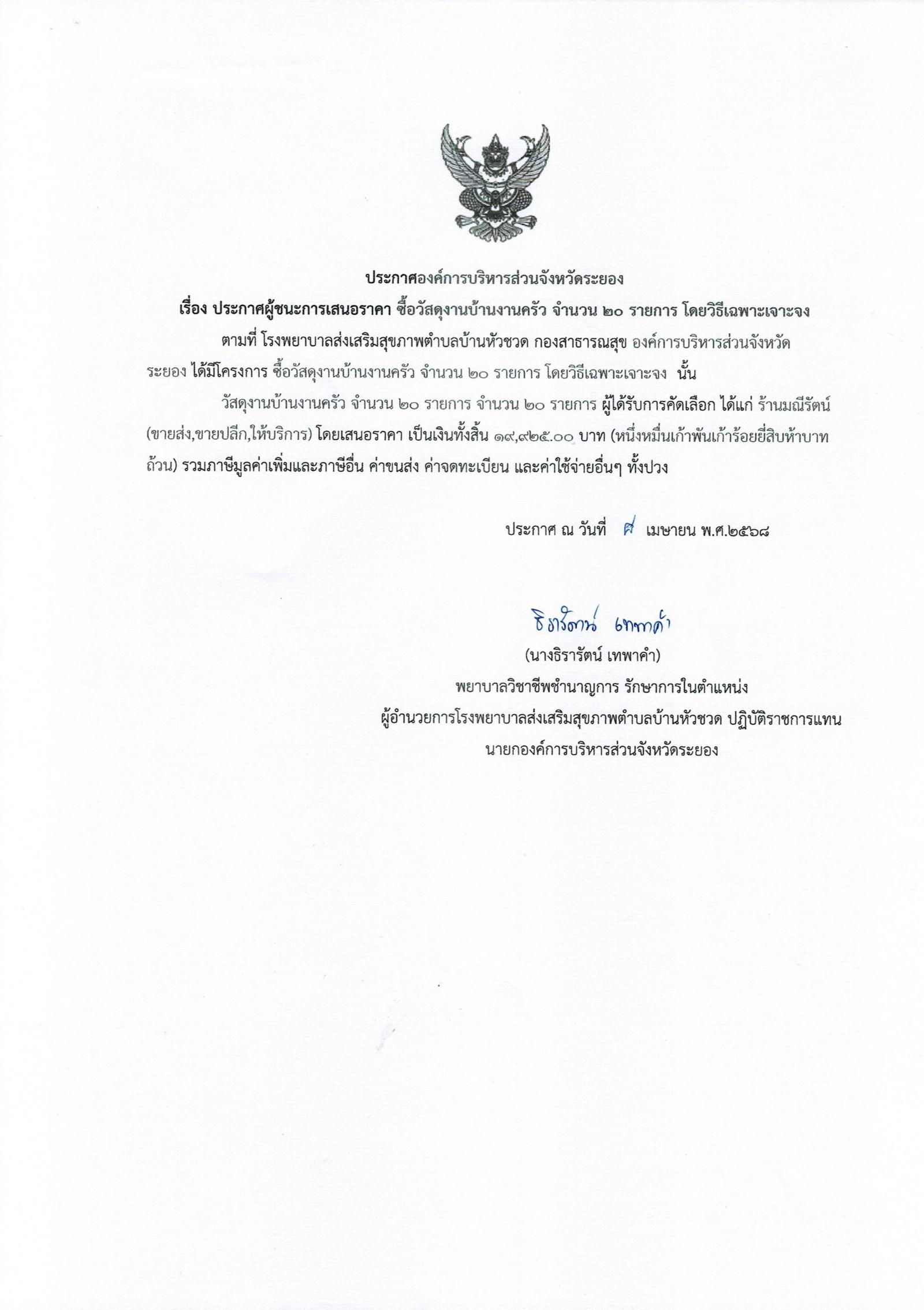 ประกาศผู้ชนะการเสนอราคา ซื้อวัสดุงานบ้านงานครัว จำนวน 20 รายการ โอยวิธีเฉพาะเจาะจง