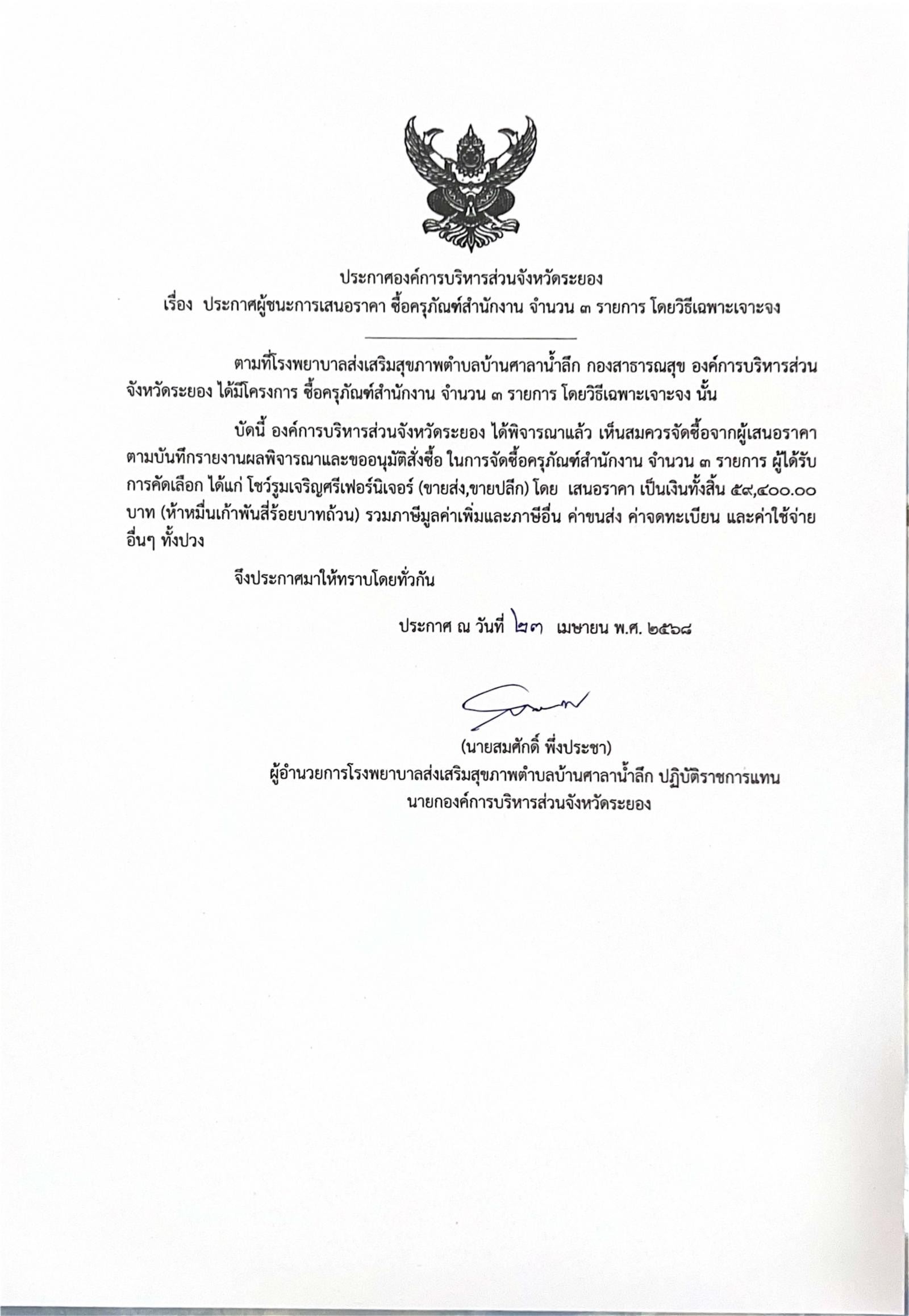 ประกาศผู้ชนะการเสนอราคา ซื้อครุภัณฑ์สำนักงาน จำนวน ๓ รายการ โดยวิธีเฉพาะเจาะจง