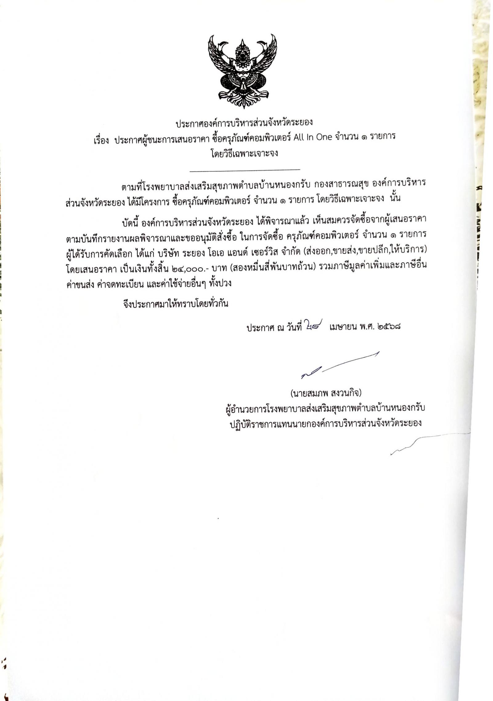 ประกาศผู้ชนะการเสนอราคา ซื้อครุภัณฑ์คอมพิวเตอร์ All In One จำนวน 1 รายการ โดยวิธีเฉพาะเจาะจง