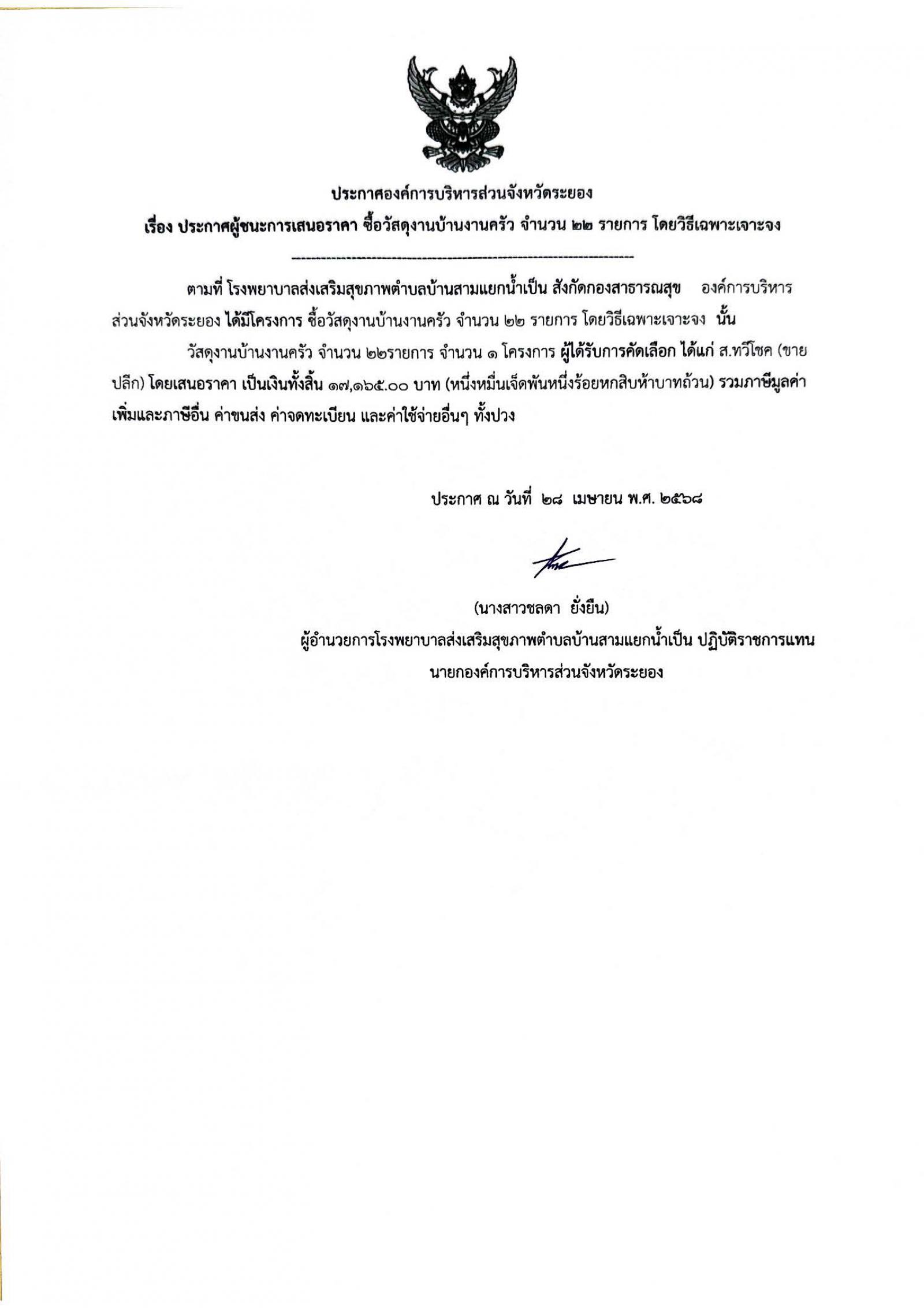 📌ประกาศผู้ชนะการเสนอราีคา จ้างเหมาจัดทำทำเนียบองค์การบริหารส่วนจัหวัดระยอง