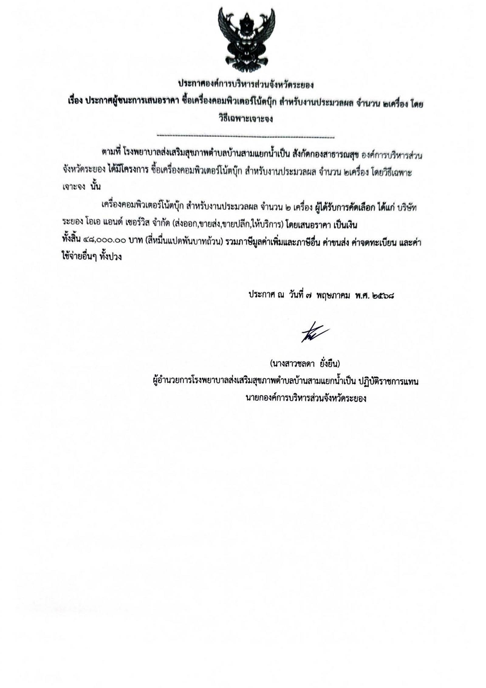 📌ประกาศผู้ชนะการเสนอราีคา จ้างเหมาจัดทำทำเนียบองค์การบริหารส่วนจัหวัดระยอง