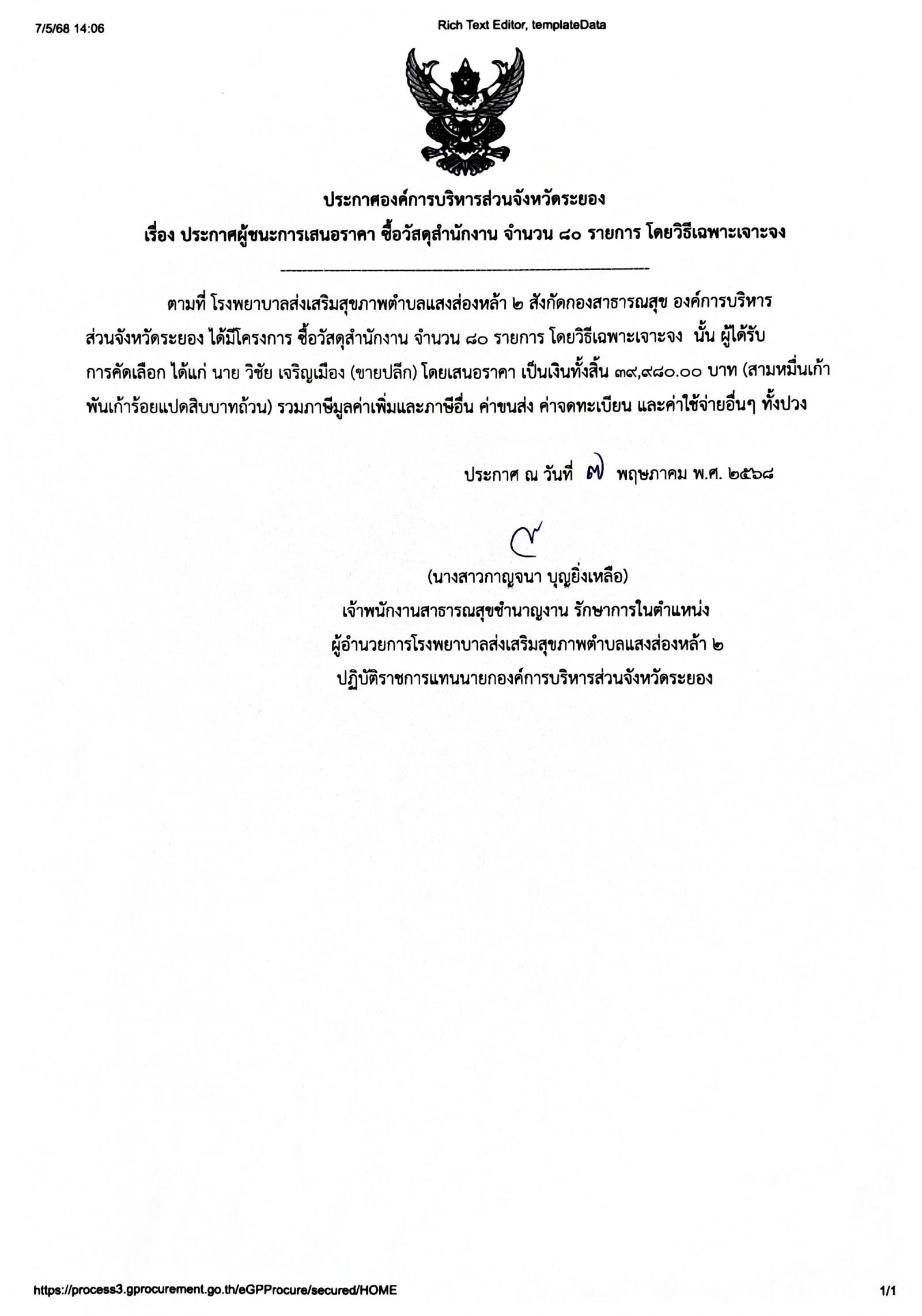 📌ประกาศผู้ชนะการเสนอราีคา จ้างเหมาจัดทำทำเนียบองค์การบริหารส่วนจัหวัดระยอง