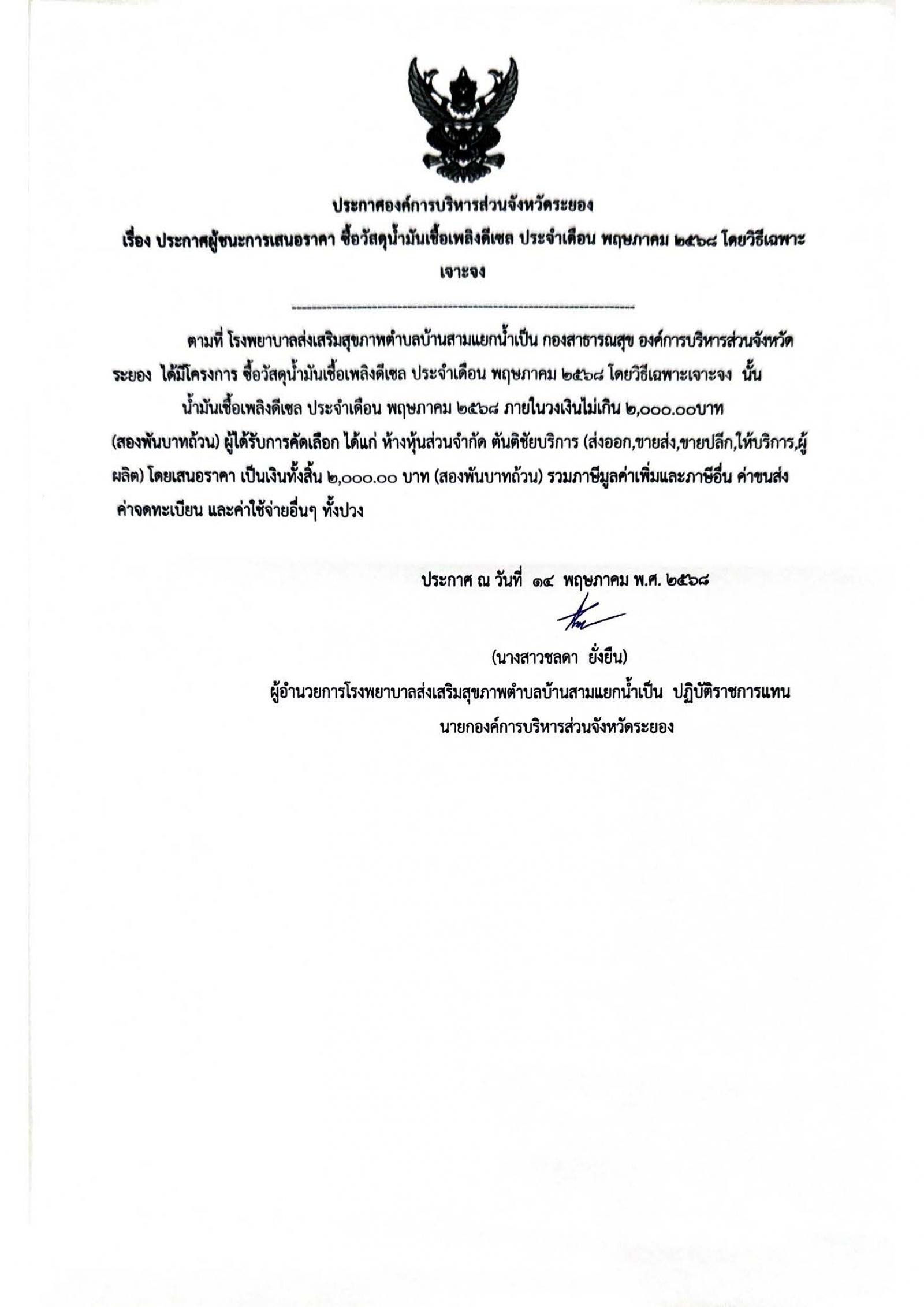ประกาศผู้ชนะการเสนอราคา ซื้อวัสดุน้ำมันเชื้อเพลิงดีเซล ประจำเดือน 2568 โดยวิธีเฉพาะเจาะจง