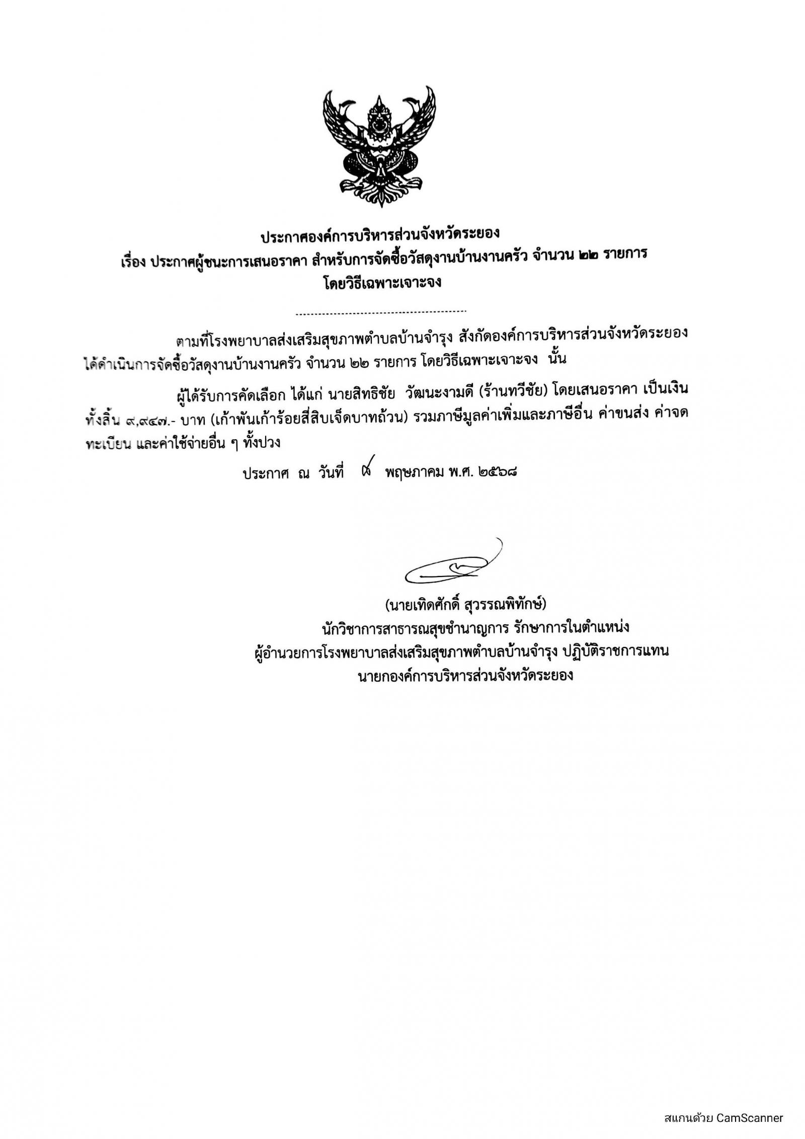 📌ประกาศผู้ชนะการเสนอราีคา จ้างเหมาจัดทำทำเนียบองค์การบริหารส่วนจัหวัดระยอง