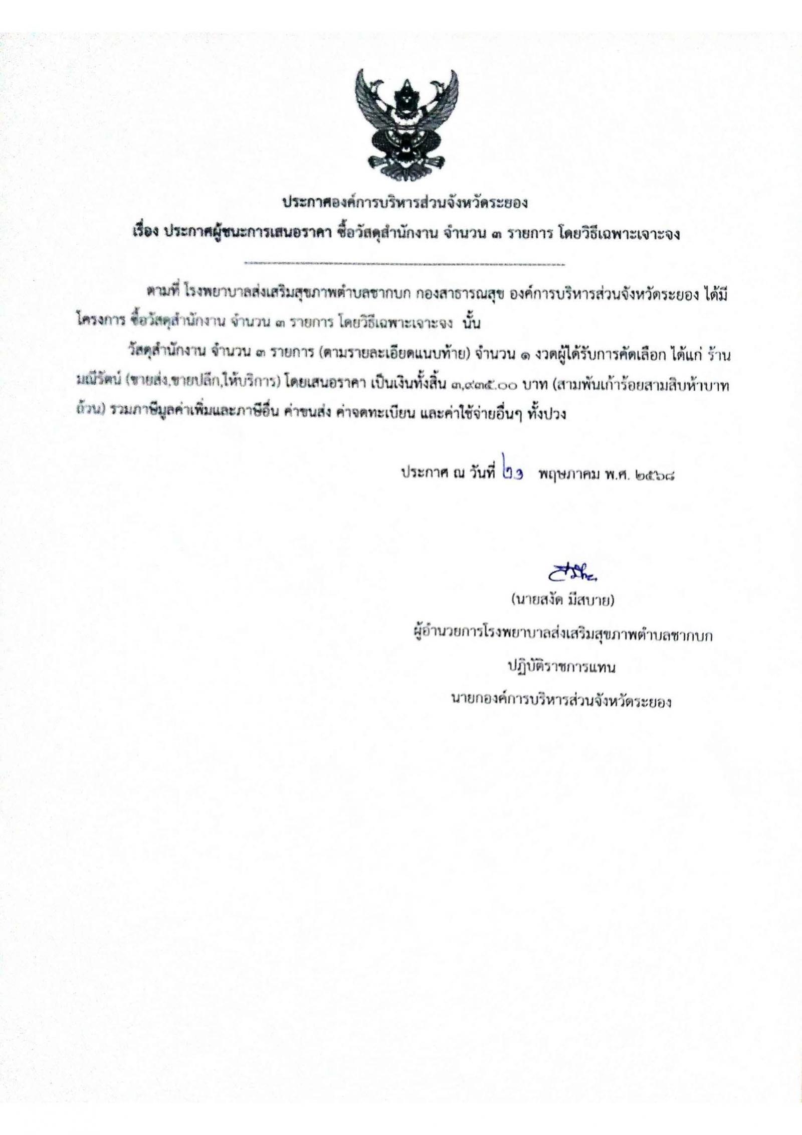 📌ประกาศผู้ชนะการเสนอราีคา จ้างเหมาจัดทำทำเนียบองค์การบริหารส่วนจัหวัดระยอง
