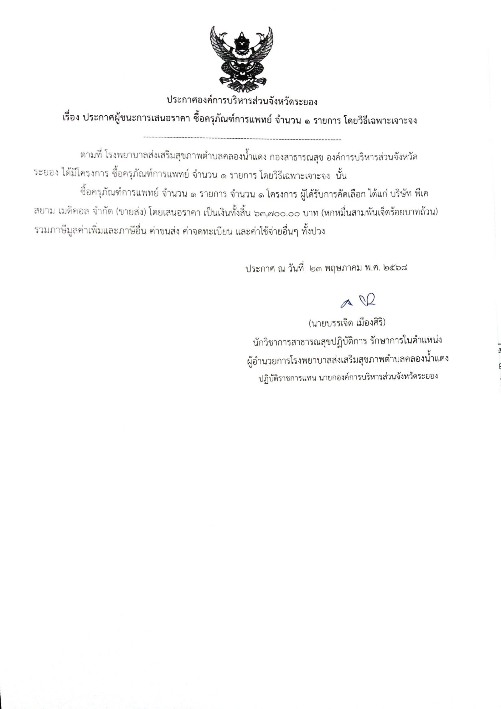 ประกาศผู้ชนะการเสนอราคา ซื้อครุภัณฑ์การแพทย์ จำนวน 1 รายการ โดยวิธีเฉพาะเจาะจง