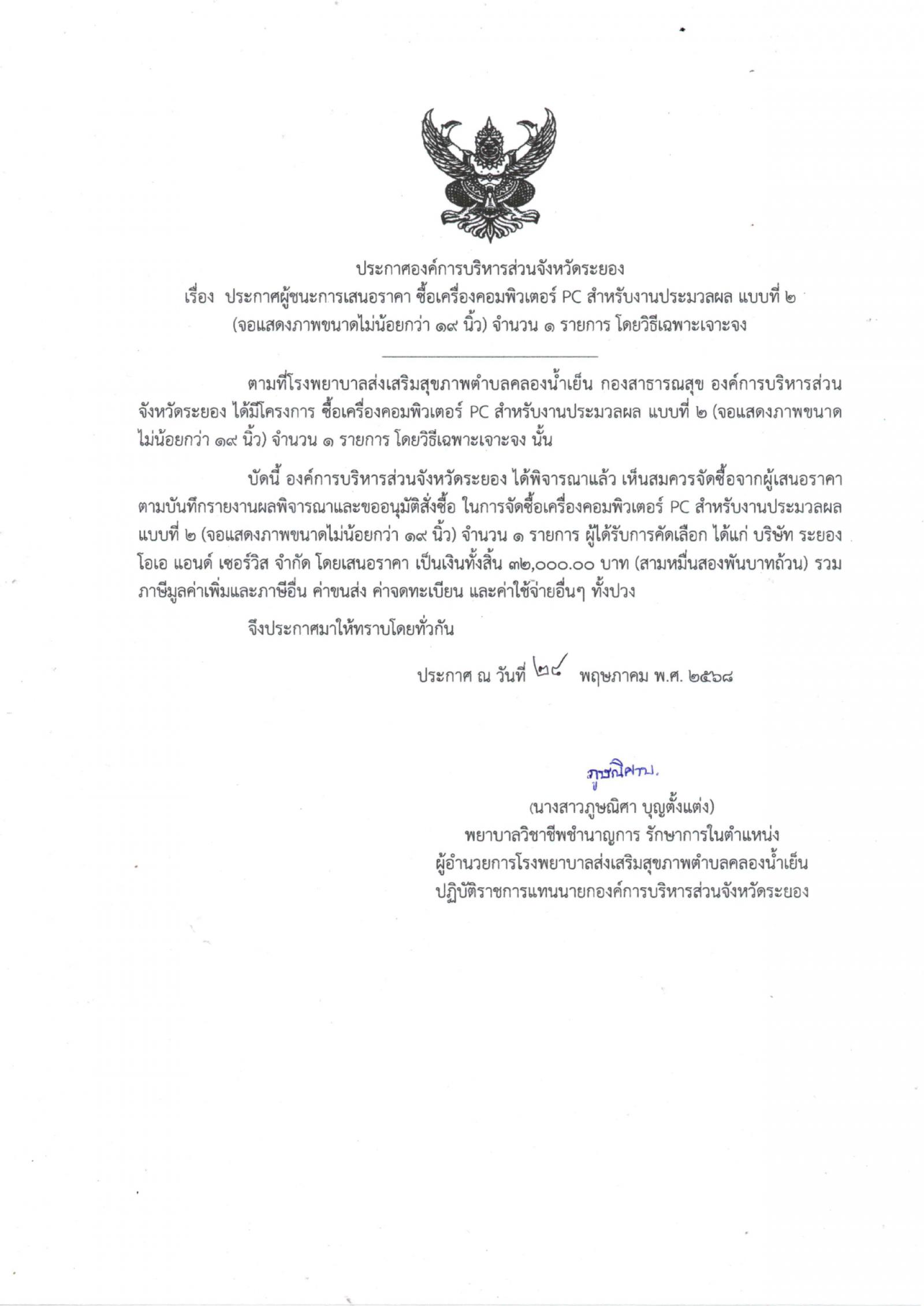 ประกาศผู้ชนะการเสนอราคา ซื้อเครื่องคอมพิวเตอร์ PC สำหรับงานประมวลผล แบบที่ 2 (จอแสดงภาพขนาดไม่น้อยกว่า 19 นิ้ว) จำนวน 1 รายการ โดยวิธีเฉพาะเจาะจง