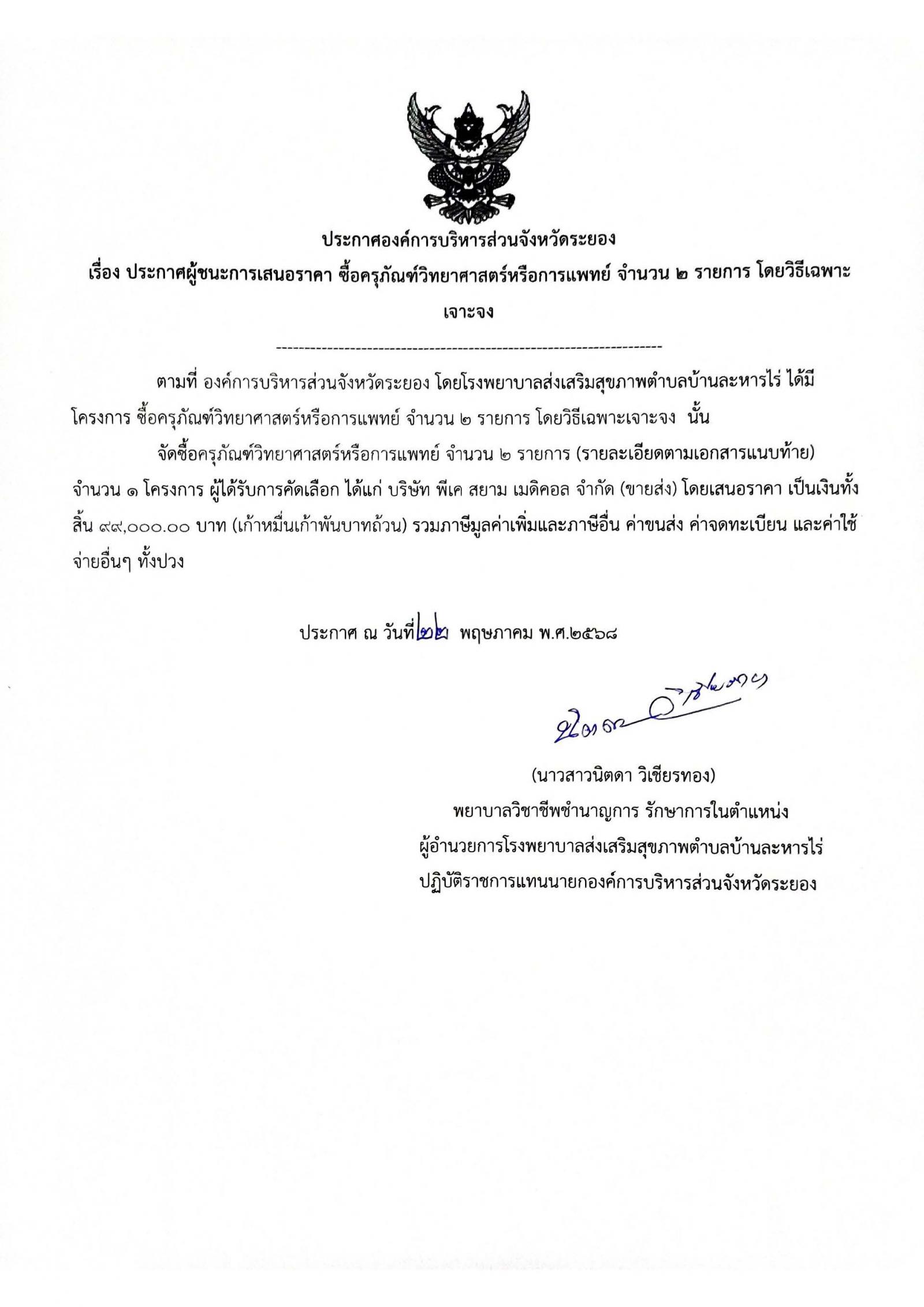 📌ประกาศผู้ชนะการเสนอราีคา จ้างเหมาจัดทำทำเนียบองค์การบริหารส่วนจัหวัดระยอง