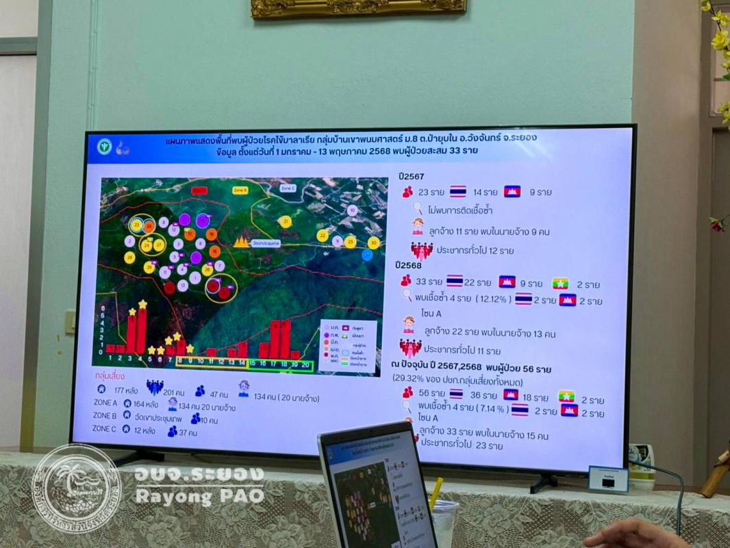 ด้วยสถานการณ์โรคไข้มาลาเรีย จังหวัดระยอง ปี 2568 ตั้งแต่วันที่ 1 มกราคม ถึง 24 พฤษภาคม 2568 มีผู้ป่วยสะสม 103 ราย คิดเป็นอัตราป่วย 0.13 ต่อประชากรพันคน ซึ่งส่วนใหญ่ผู้ป่วยประกอบอาชีพ ทำสวนยาง โดยเฉพาะในพื้นที่ตำบลป่ายุบใน อำเภอวังจันทร์ จังหวัดระยอง