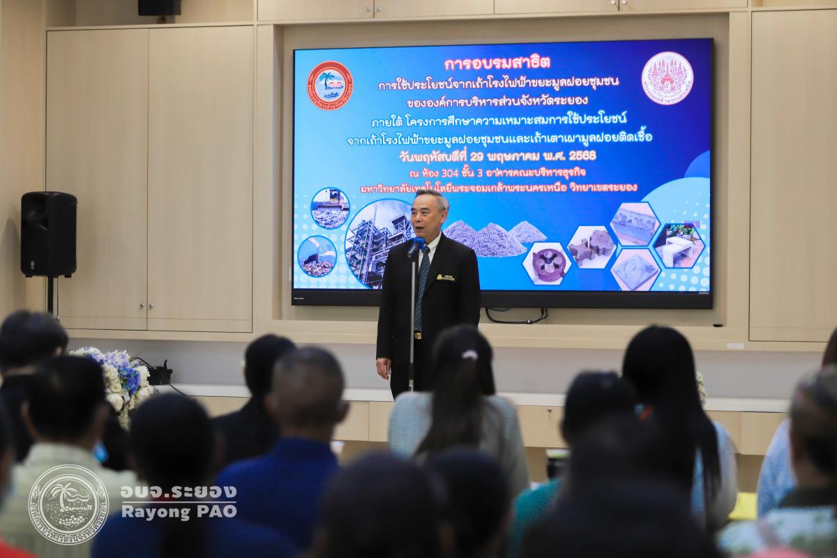 วันที่ 29 พฤษภาคม 2568 เวลา 10.00 น. นายปิยะ ปิตุเตชะ นายกองค์การบริหารส่วนจังหวัดระยอง เข้าร่วมพิธีเปิดการอบรมสาธิตการใช้ประโยชน์จากเถ้าโรงไฟฟ้าขยะมูลฝอยชุมชน และเถ้าเตาเผามูลฝอยติดเชื้อ ขององค์การบริหารส่วนจังหวัดระยอง โดยมีนายพิรุณ เหมะรักษ์ ผู้ทรงคุณวุฒิเฉพาะด้านพลังงานและสิ่งแวดล้อม เป็นประธานในพิธีฯ พร้อมด้วย นายสุริยะ ศิริวัฒน์ ผู้อำนวยการกองสาธารณสุข เป็นผู้กล่าวรายงาน, ศาสตราจารย์ ดร.ธานินทร์ ศิลป์จารุ อธิบดีมหาวิทยาลัยเทคโนโลยีพระจอมเกล้าพระนครเหนือ เป็นผู้กล่าวต้อนรับ, คณะผู้บริหาร หัวหน้าส่วนราชการ คณะครู ประชาชน และผู้ที่เกี่ยวข้องเข้าร่วมอย่างพร้อมเพรียง