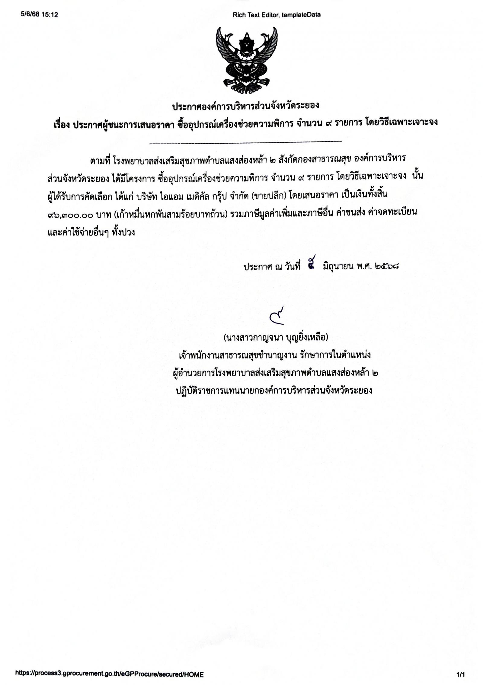 ประกาศผู้ชนะการเสนอราคา ซื้ออุปกรณ์เครื่องช่วยความพิการ จำนวน 9 รายการ โดยวิธีเฉพาะเจาะจง