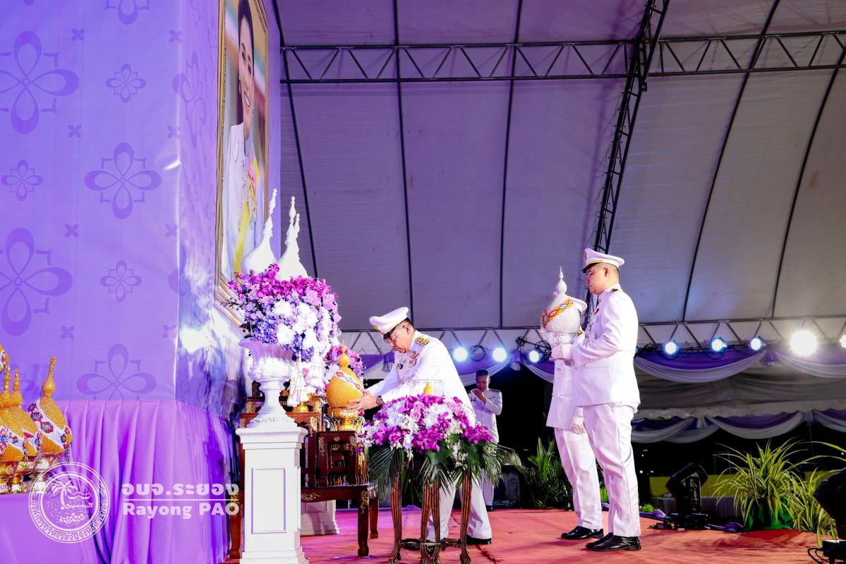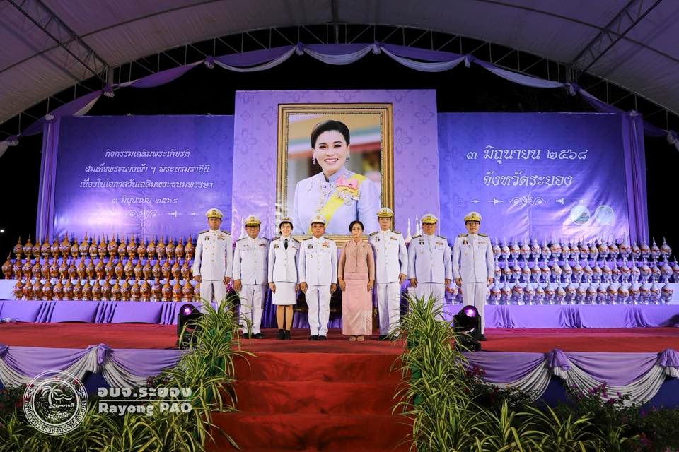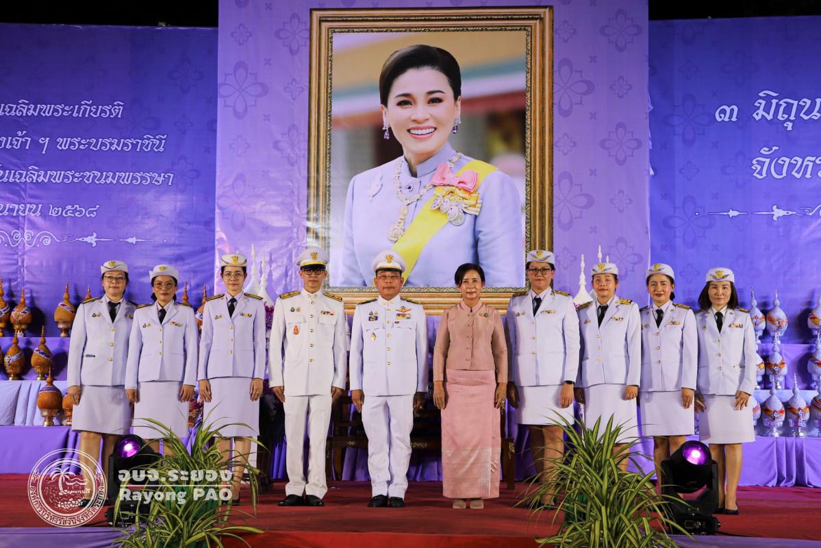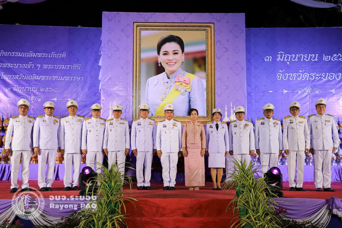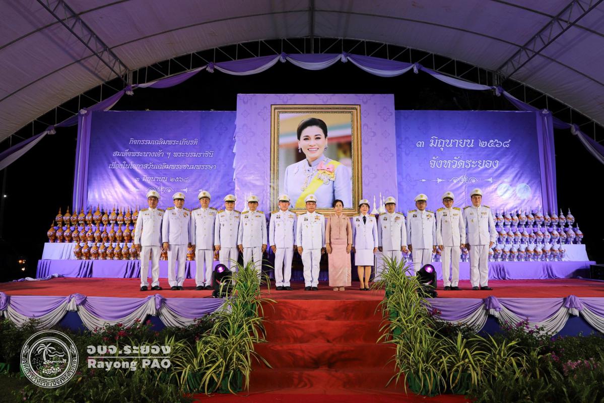 วันที่ 3 มิถุนายน 2568 เวลา 17.30 น. ณ. สวนศรีเมือง อำเภอเมืองระยอง จังหวัดระยอง องค์การบริหารส่วนจังหวัดระยอง นำโดย นายชาญณรงค์ แย้มเอม เลขานุการองค์การบริหารส่วนจังหวัด พร้อมด้วยข้าราชการ อบจ.ระยอง เข้าร่วมกิจกรรมเฉลิมพระเกียรติสมเด็จพระนางเจ้าสุทิดา พัชรสุธาพิมลลักษณ พระบรมราชินี เนื่องในโอกาสวันเฉลิมพระชนมพรรษา 3 มิถุนายน 2568 โดยมีนายไตรภพ วงศ์ไตรรัตน์ ผู้ว่าราชการจังหวัดระยอง เป็นประธานในพิธีนำหัวหน้าส่วนราชการ ทหาร ตำรวจ ภาคเอกชน และประชาชนทุกหมู่เหล่า วางพานพุ่ม เปิดกรวย ถวายเครื่องราชสักการะเบื้องหน้าพระฉายาลักษณ์สมเด็จพระนางเจ้าสุทิดา พัชรสุธาพิมลลักษณ พระบรมราชินี พร้อมทั้งกล่าวคำถวายพระพรและจุดเทียนพระพรชัยมงคล เนื่องในโอกาสมหามงคลวันเฉลิมพระชนมพรรษา 3 มิถุนายน 2568