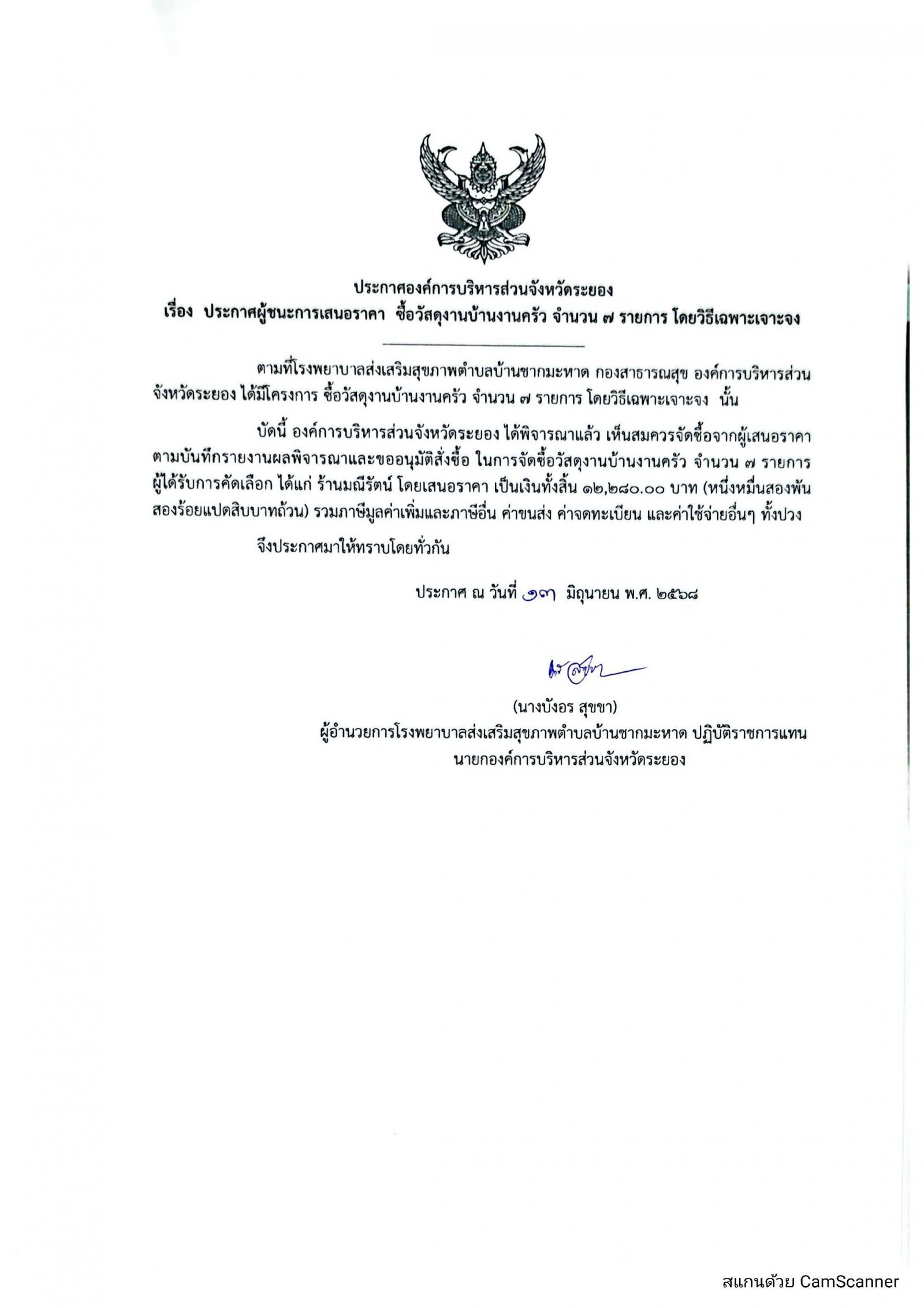 📌ประกาศผู้ชนะการเสนอราีคา จ้างเหมาจัดทำทำเนียบองค์การบริหารส่วนจัหวัดระยอง