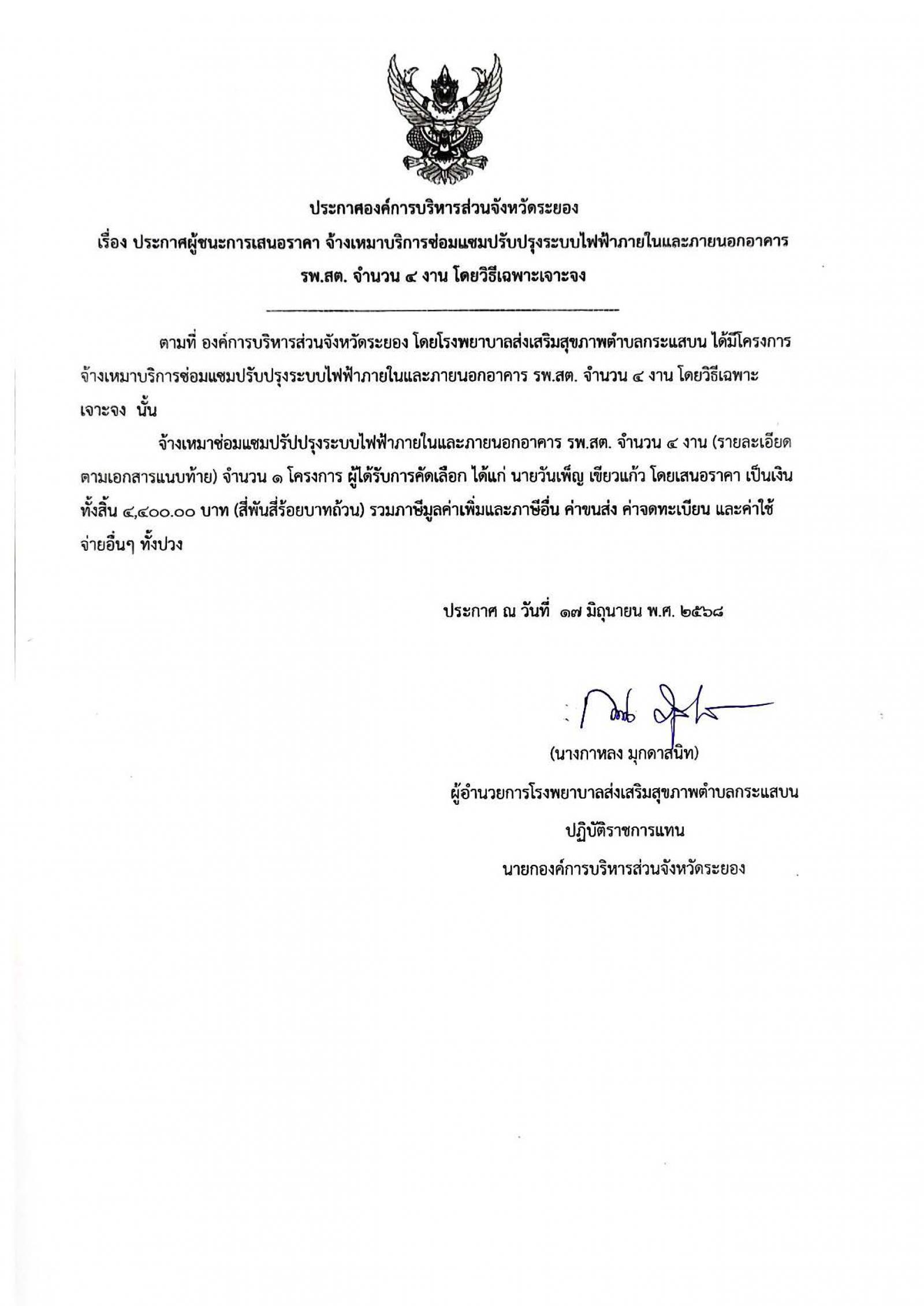 ประกาศผู้ชนะการเสนอราคา จ้างเหมาบริการซ่อมแซมปรับปรุงระบบไฟฟ้าภายในและภายนอกอาคาร รพ.สต. จำนวน 4 งาน โดยวิธีเฉพาะเจาะจง
