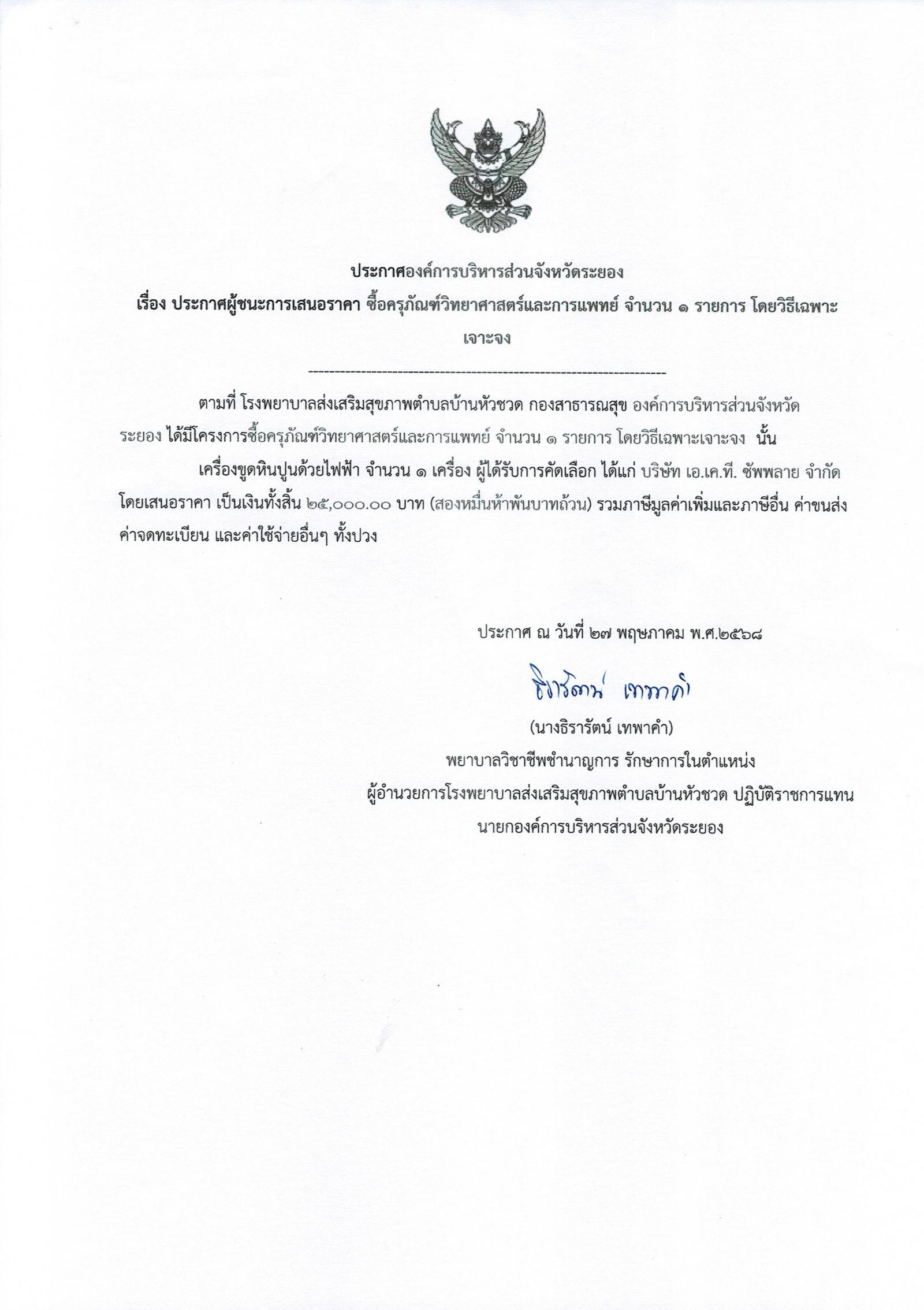 📌ประกาศผู้ชนะการเสนอราีคา จ้างเหมาจัดทำทำเนียบองค์การบริหารส่วนจัหวัดระยอง