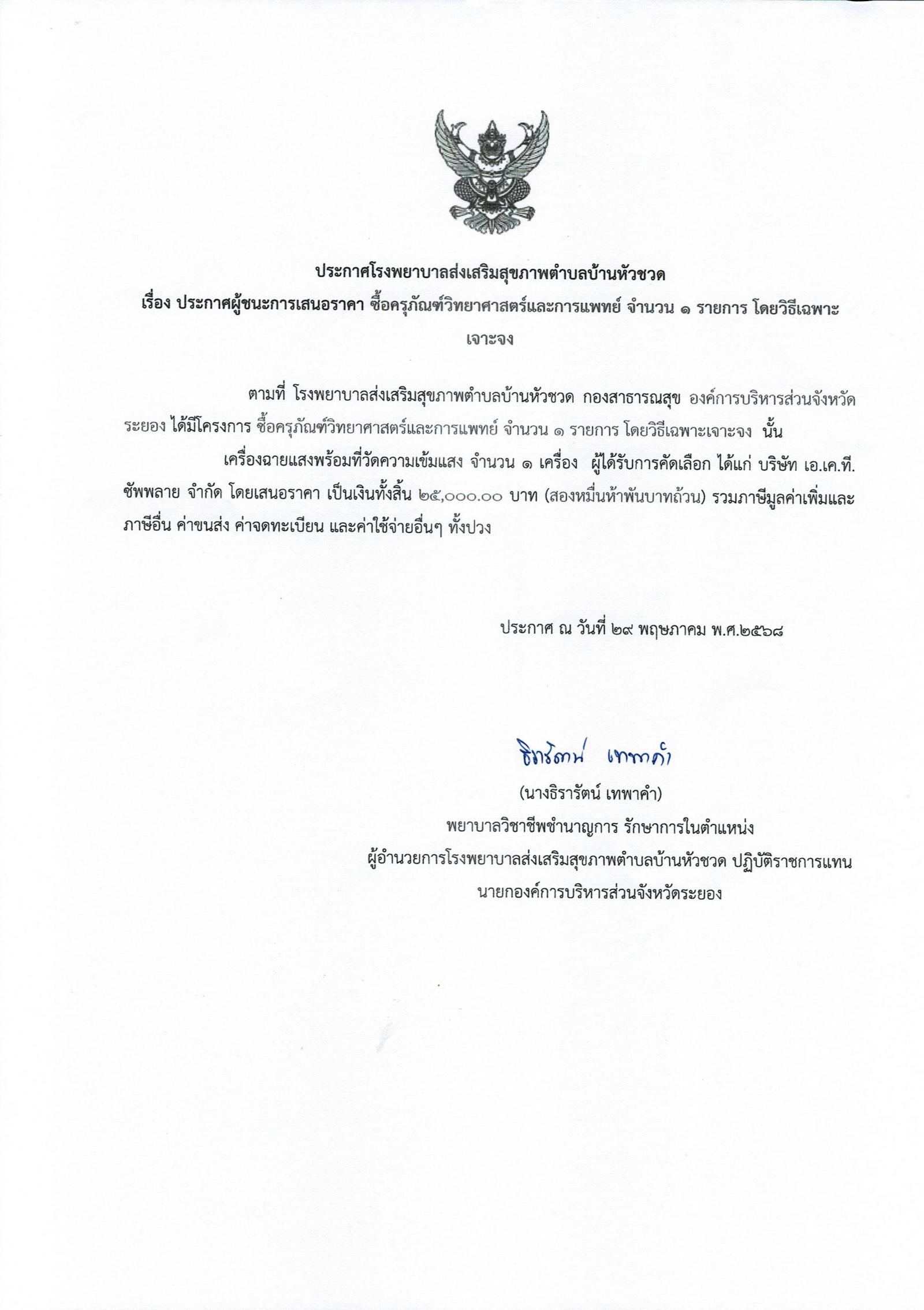 ประกาศผู้ชนะการเสนอราคา ซื้อครุภัณฑ์วิทยาศาสตร์และการแพทย์ จำนวน 1 รายการ โดยวิธีเฉพาะเจาะจง