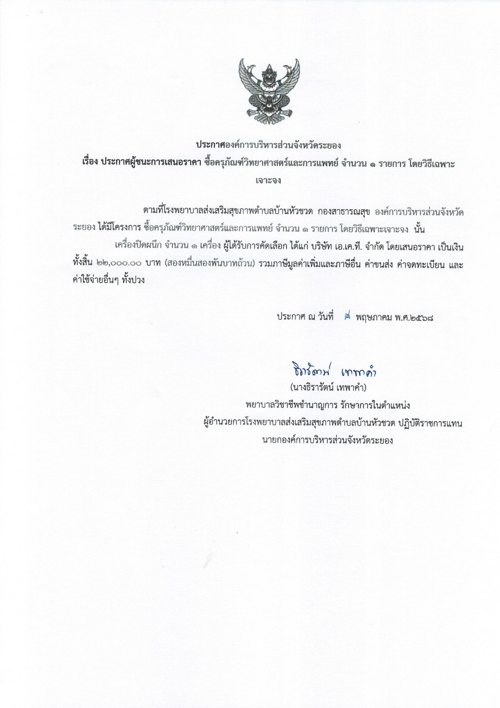 📌ประกาศผู้ชนะการเสนอราีคา จ้างเหมาจัดทำทำเนียบองค์การบริหารส่วนจัหวัดระยอง