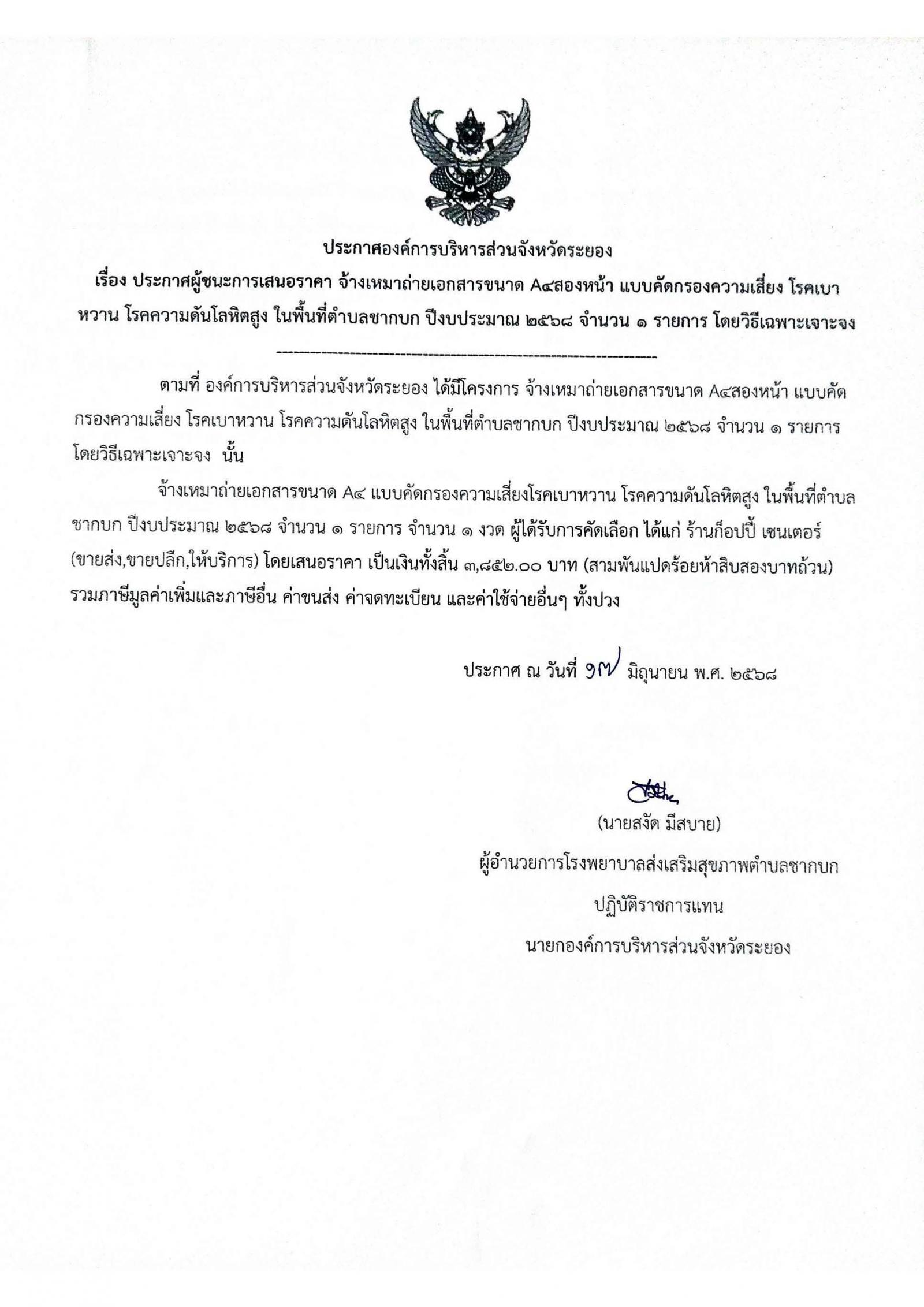 ประกาศผู้ชนะการเสนอราคา จ้างเหมาถ่ายเอกสารขนาด A4 สองหน้า แบบคัดกรองความเสี่ยง โรคเบาหวาน โรคความดัดโลหิตสูง ในพื้นที่ตำบลชากบก ปีงบประมาณ 2568 จำนวน 1 รายการ โดยวิธีเฉพาะเจาะจง