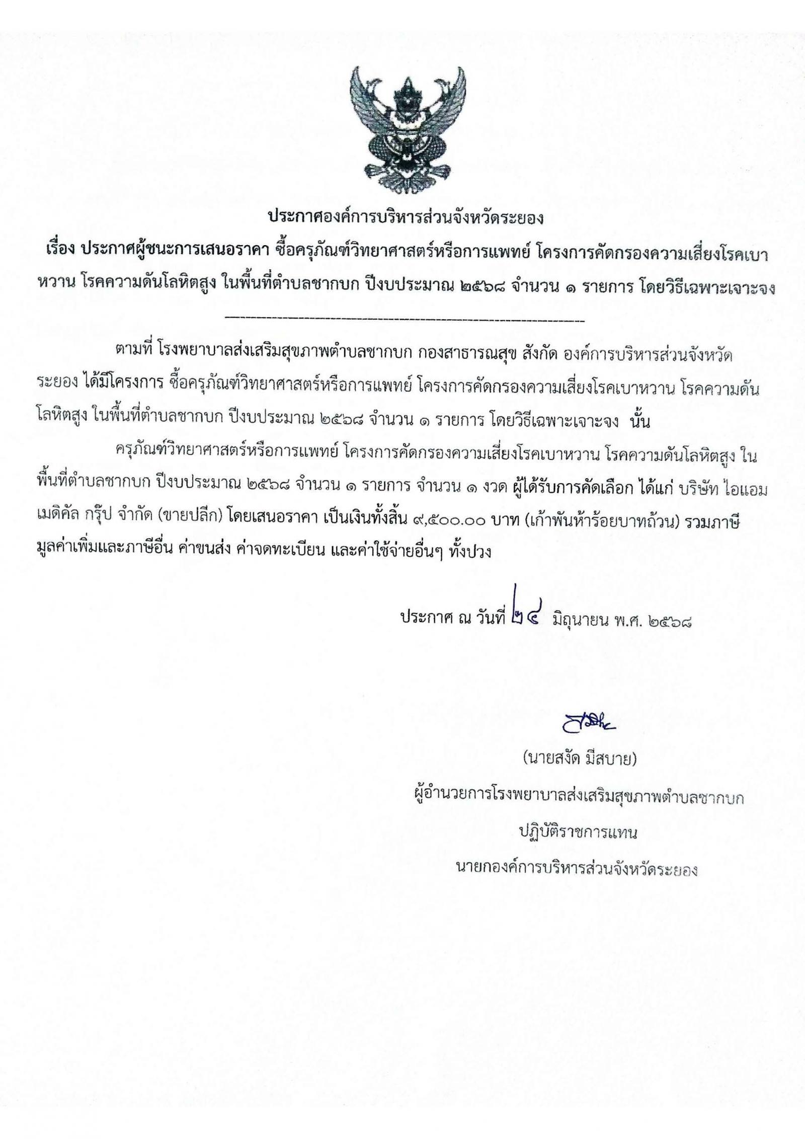 ประกาศผู้ชนะการเสนอราคา ซื้อครุภัณฑ์วิทยาศาสตร์หรือการแพทย์ โครงการคัดกรองความเสี่ยงโรคเบาหวาน โรคความดันโลหิตสูง ในพื้นที่ตำบลชากบก ปีงบประมาณ 2568 จำนวน 1 รายการ โดยวิธีเฉพาะเจาะจง