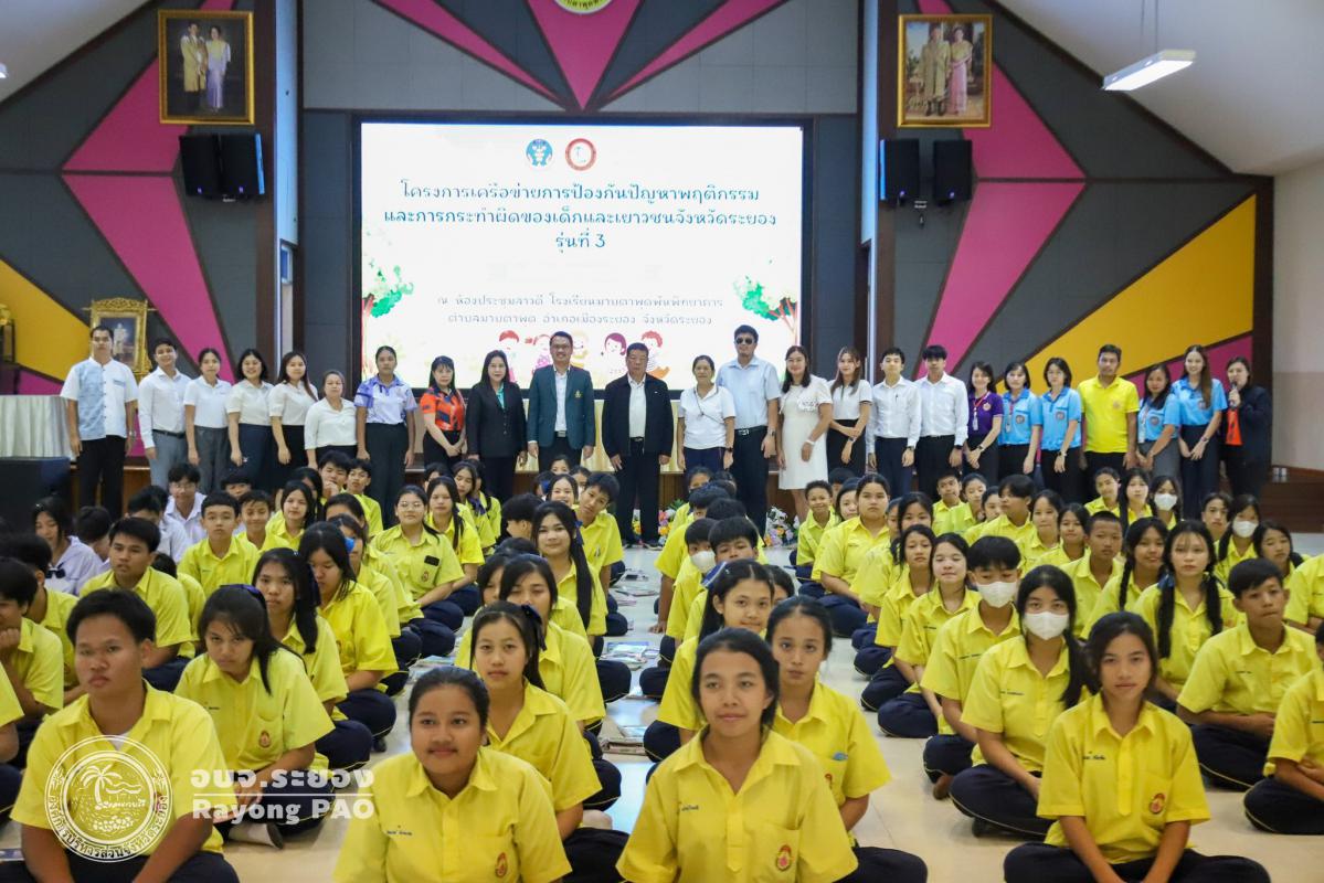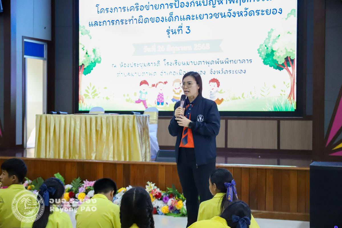 วันที่ 26 มิถุนายน 2568 เวลา 13.00 น. นายธงชัย มั่นคง ผู้เชี่ยวชาญด้านการศึกษา ศาสนา และวัฒนธรรมองค์การบริหารส่วนจังหวัดระยอง เป็นประธานในพิธีเปิดโครงการเครือข่ายการป้องกันปัญหาพฤติกรรมและการกระทำผิดของเด็กและเยาวชนจังหวัดระยอง รุ่นที่ 3 โดยมีวัตถุประสงค์เพื่อส่งเสริมและพัฒนาเด็กและเยาวชนให้มีความรู้ความเข้าใจ และปลูกฝังจิตสำนึกในเรื่องกฎหมายและกระบวนการยุติธรรม เฝ้าระวังและลดปัญหาพฤติกรรมเสี่ยงและการกระทำผิดของเด็กและเยาวชนในพื้นที่จังหวัดระยอง ซึ่งมีนักเรียนจากโรงเรียนมาบตาพุดพันพิทยาคาร จำนวน 100 คน เข้าร่วมโครงการฯอย่างพร้อมเพรียงกัน ณ โรงเรียนมาบตาพุดพันพิทยาคาร อำเภอเมืองระยอง จังหวัดระยอง