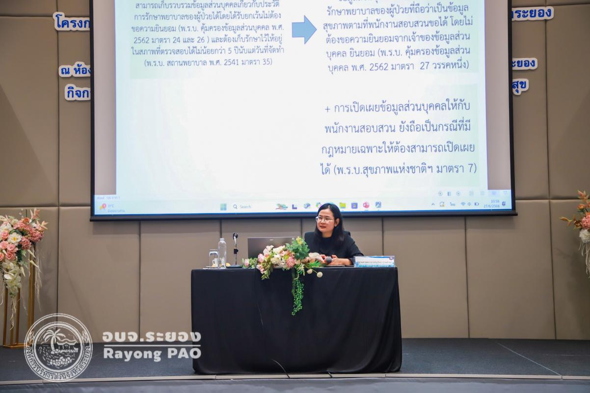 วันที่ 27 มิถุนายน 2568 เวลา 09.00 น. กองสาธารณสุข องค์การบริหารส่วนจังหวัดระยอง จัดโครงการพัฒนาศักยภาพบุคลากรด้านสาธารณสุข ในสังกัดองค์การบริหารส่วนจังหวัดระยอง กิจกรรมอบรมข้อกฎหมายคุ้มครองข้อมูลส่วนบุคคลสำหรับหน่วยบริการสาธารณสุข (Personal Data Protection Act : PDPA) ในระหว่างวันที่ 26-27 มิถุนายน 2568 ณ โรงแรมแทมมารินด์ การ์เด้น ระยอง ซึ่งผู้เข้ารับอบรมจะได้รับความรู้จากทีมวิทยากรวิทยาลัยการปกครองท้องถิ่น มหาวิทยาลัยขอนแก่น และมหาวิทยาลัยแม่ฟ้าหลวง สำนักวิชานิติศาสตร์