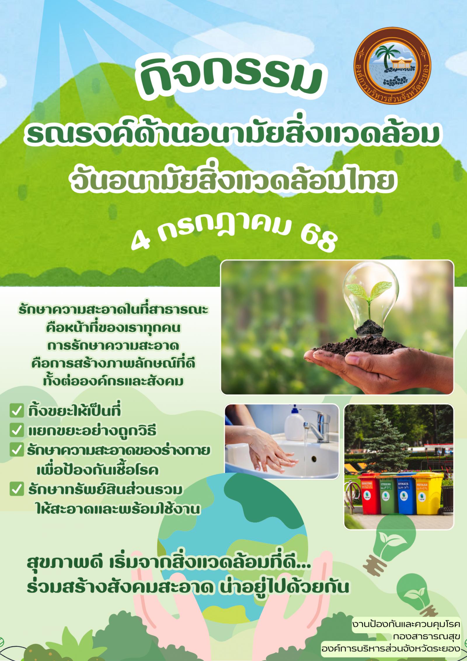 ด้วยจังหวัดระยอง มีหนังสือ ที่ รย ๐๐๒๓.๖/ว ๑๒๔๖ ลงวันที่ ๒๖ มิถุนายน ๒๕๖๘ แจ้งว่า กรมอนามัยได้ดำเนินงานโครงการวันอนามัยสิ่งแวดล้อมไทย ประจำปี ๒๕๖๘ เพื่อเทิดพระเกียรติศาสตราจารย์ ดร. สมเด็จพระเจ้าน้องนางเธอเจ้าฟ้าจุฬาภรณวลัยลักษณ์ อัครราชกุมารี กรมพระศรีสวางควัฒน วรขัตติยราชนารี ที่พระองค์ทรงมีพระกรุณาธิคุณพระราชทานพระอนุญาตให้วันที่ ๔ กรกฎาคมของทุกปีเป็น “วันอนามัยสิ่งแวดล้อมไทย” และมีการจัดกิจกรรมภายใต้หัวข้อ “อนามัยสิ่งแวดล้อมกับวิถีชีวิตสู่สุขภาวะที่ยั่งยืน” (Environmental Health for Healthy Lifestyles and Sustainable Well-Being) จึงขอประชาสัมพันธ์กิจกรรมรณรงค์ฯ ให้องค์กรปกครองส่วนท้องถิ่นทราบ และร่วมจัดกิจกรรมด้านอนามัยสิ่งแวดล้อม “๔ กรกฎาคม วันอนามัยสิ่งแวดล้อมไทย” ประจำปี ๒๕๖๘ ภายใต้หัวข้อดังกล่าว ตั้งแต่วันนี้จนถึง ๓๑ กรกฎาคม ๒๕๖๘ โดยองค์กรปกครองส่วนท้องถิ่นที่เข้าร่วมกิจกรรม และส่งรายงานผลการเข้าร่วมกิจกรรมตามแบบฟอร์มรณรงค์ฯ จะได้รับใบประกาศเกียรติคุณการเข้าร่วมกิจกรรมรณรงค์ด้านอนามัยสิ่งแวดล้อมจากกรมอนามัย กระทรวงสาธารณสุข รายละเอียดปรากฏตามเอกสารที่แนบมาพร้อมนี้
