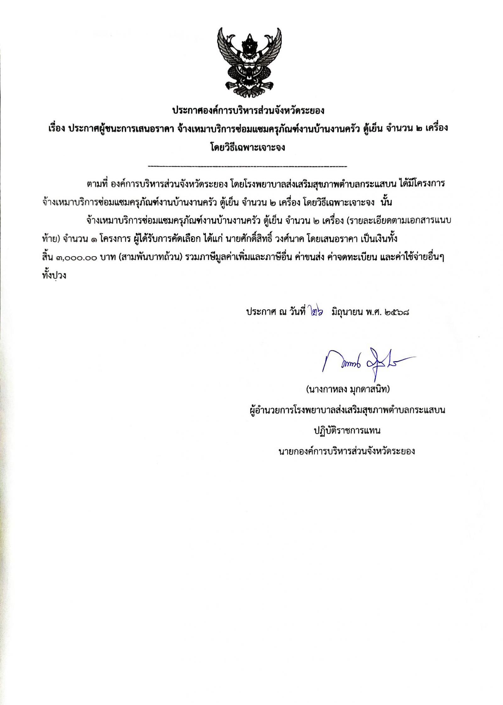 📌ประกาศผู้ชนะการเสนอราีคา จ้างเหมาจัดทำทำเนียบองค์การบริหารส่วนจัหวัดระยอง