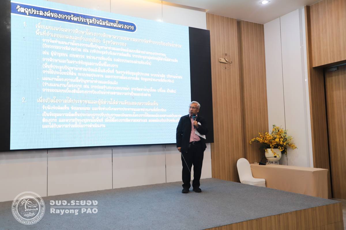 วันที่ 8 มิถุนายน 2568 เวลา 09.45 น. นายประสานต์ พฤกษาชาติ รองนายกองค์การบริหารส่วนจังหวัดระยอง (2) ให้เกียรติเป็นประธานเปิดการประชุมปัจฉิมนิเทศ โครงการศึกษาความเหมาะสมการจัดทำระบบป้องกันน้ำท่วมพื้นที่อำเภอแกลง และอำเภอเมือง จังหวัดระยอง พร้อมด้วย นายนาวิน เจริญพร สมาชิกสภา เขต 2 อำเภอแกลง, นายธวัชชัย เจริญรื่น สมาชิกสภา เขต 4 อำเภอแกลง, นางสาวศศิธร ทรงประโคน ผู้เชี่ยวชาญด้านสิ่งแวดล้อม, หัวหน้าส่วนราชการ หน่วยงานภาครัฐ ภาคเอกชน ประชาชน และเจ้าหน้าที่ที่เกี่ยวข้องเข้าร่วมพิธีเปิดอย่างพร้อมเพียงกัน ซึ่งโครงการดังกล่าวจัดขึ้นเพื่อวางแผนการบริหารจัดการน้ำอย่างเป็นระบบ ลดผลกระทบจากอุทกภัยในพื้นที่อำเภอแกลง และอำเภอเมือง จังหวัดระยอง รวมถึงเพิ่มประสิทธิภาพในการระบายน้ำ และป้องกันการเสียหายต่อชีวิตและทรัพย์สินของประชาชนในระยะยาว ณ โรงแรมเดอะโพเอ็ม แม่พิมพ์ อำเภอแกลง จังหวัดระยอง