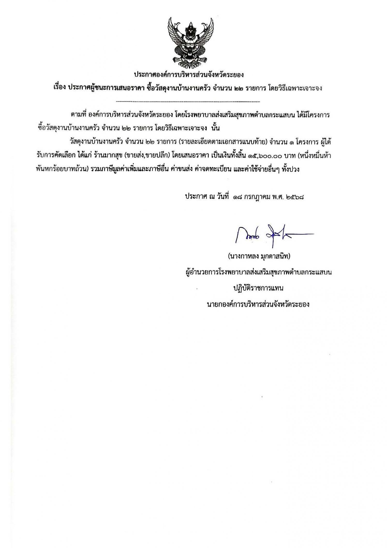 ประกาศผู้ชนะการเสนอราคา ซื้อวัสดุงานบ้านงานครัว จำนวน 22 รายการ โดยวิธีเฉพาะเจาะจง
