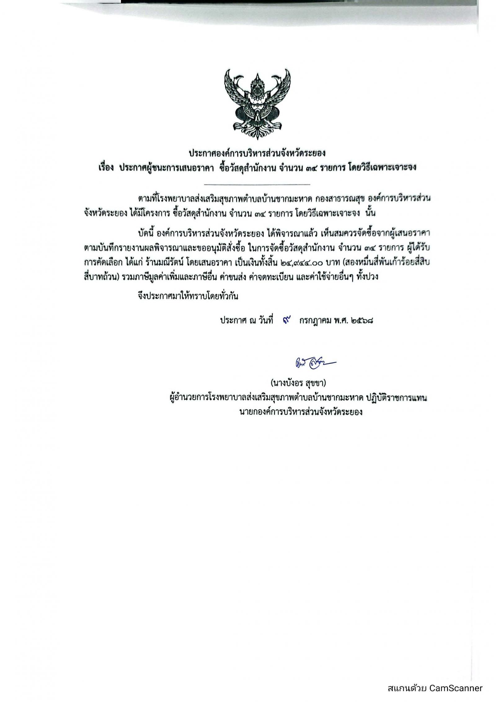 📌ประกาศผู้ชนะการเสนอราีคา จ้างเหมาจัดทำทำเนียบองค์การบริหารส่วนจัหวัดระยอง