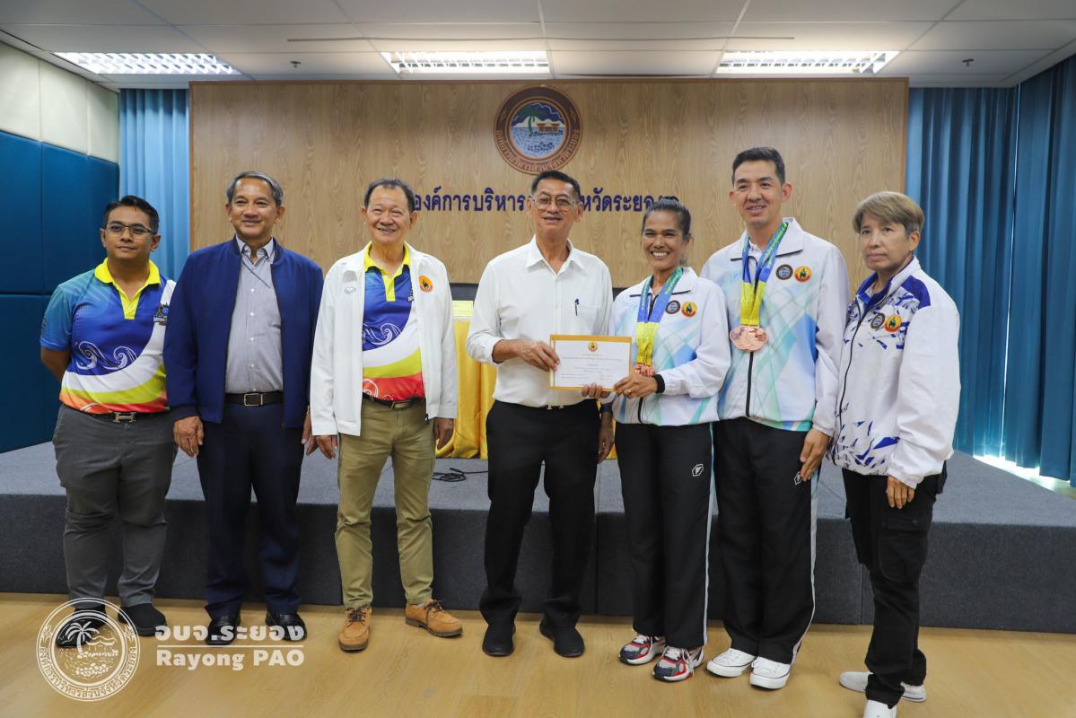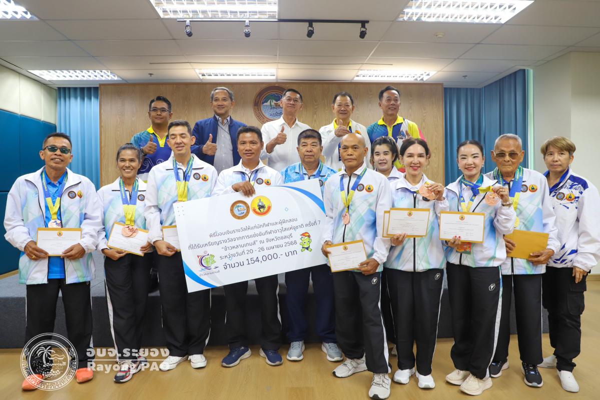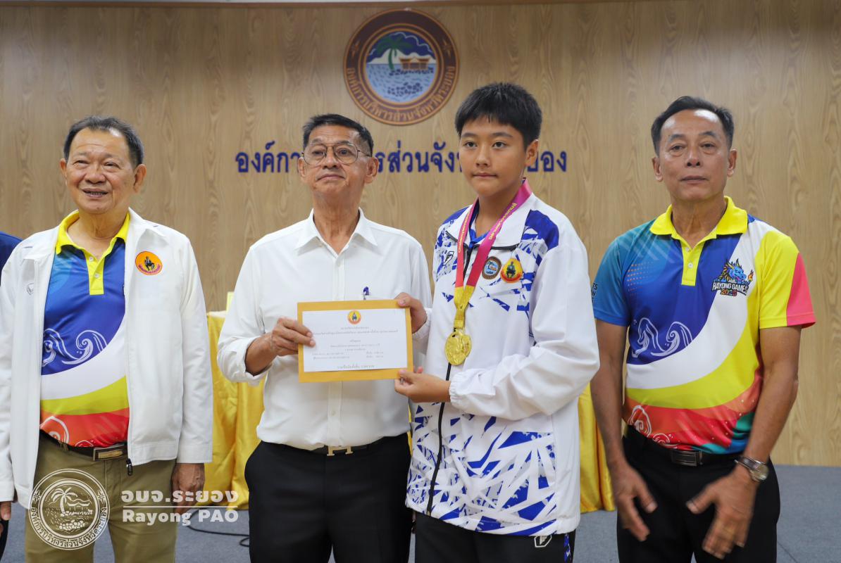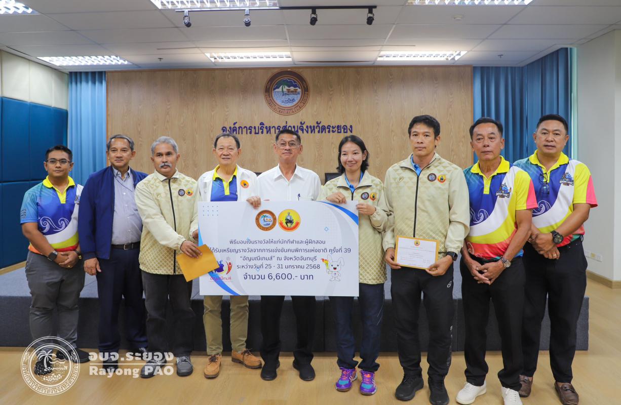 วันที่ 17 กรกฎาคม 2568 เวลา 14.00 น. นายปิยะ ปิตุเตชะ นายกองค์การบริหารส่วนจังหวัดระยอง เป็นประธานในพิธีมอบเงินค่าเหรียญรางวัลให้กับนักกีฬาและผู้ฝึกสอน พร้อมด้วย นายวิเชียร แสงวงศ์กิจ นายกสมาคมกีฬาแห่งจังหวัดระยอง นายประสาต์ พฤกษาชาติ รองนายกอบจ.ระยอง (2) นายพายัพ ผ่องใส เลขานุการนายกอบจ.ระยอง นายมนัส สมศักดิ์ สมาชิกสภาอบจ.ระยอง เขต 1 อำเภอวังจันทร์ และเจ้าหน้าที่ที่เกี่ยวข้อง เข้าร่วมพิธีดังกล่าวอย่างพร้อมเพรียงกัน เพื่อเป็นการเชิดชูเกียรติและร่วมแสดงความยินดีกับนักกีฬาที่สร้างชื่อเสียงให้จังหวัดระยอง ที่เข้าร่วมแข่งขันกีฬาเยาวชนแห่งชาติ ครั้งที่ 40 จังหวัดชลบุรี กีฬาแห่งชาติ ครั้งที่ 49 จังหวัดจันทบุรี กีฬาคนพิการแห่งชาติ ครั้งที่ 39 จังหวัดจันทบุรี และกีฬาอาวุโสแห่งชาติ ครั้งที่ 7 จังหวัดชลบุรี ณ ห้องประชุม 1 ชั้น 3 อบจ.ระยอง