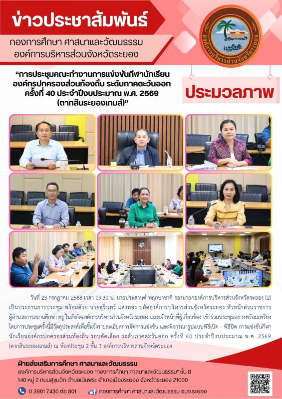 วันที่ 23 กรกฎาคม 2568 เวลา 09.30 น. นายประสานต์ พฤกษาชาติ รองนายกองค์การบริหารส่วนจังหวัดระยอง (2) เป็นประธานการประชุม พร้อมด้วย นายสุรินทร์ แสงทอง ปลัดองค์การบริหารส่วนจังหวัดระยอง หัวหน้าส่วนราชการ ผู้อำนวยการสถานศึกษา ครู ในสังกัดองค์การบริหารส่วนจังหวัดระยอง และเจ้าหน้าที่ผู้เกี่ยวข้อง เข้าร่วมประชุมอย่างพร้อมเพรียง โดยการประชุมครั้งนี้มีวัตถุประสงค์เพื่อชี้แจ้งรายละเอียดการจัดการแข่งขัน และพิจารณารูปแบบพิธีเปิด - พิธีปิด การแข่งขันกีฬานักเรียนองค์กรปกครองส่วนท้องถิ่น รอบคัดเลือก ระดับภาคตะวันออก ครั้งที่ 40 ประจำปีงบประมาณ พ.ศ. 2569 (ตากสินระยองเกมส์) ณ ห้องประชุม 2 ชั้น 3 องค์การบริหารส่วนจังหวัดระยอง