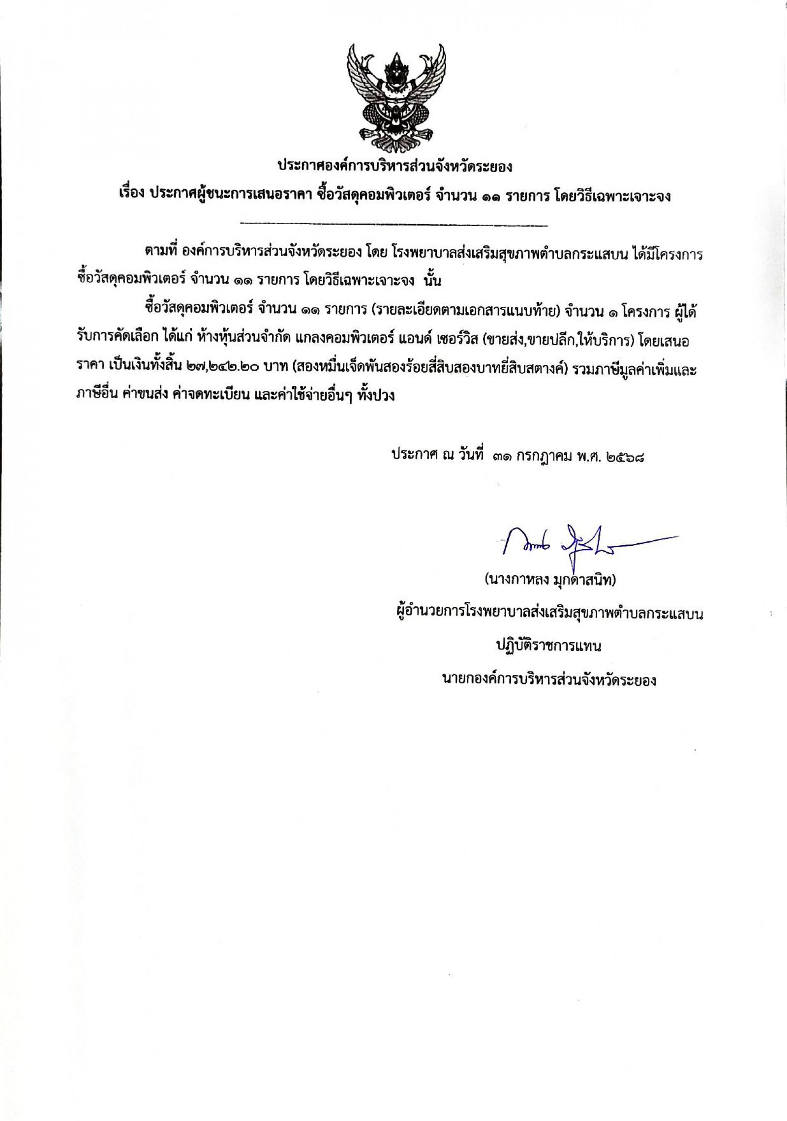 📌ประกาศผู้ชนะการเสนอราีคา จ้างเหมาจัดทำทำเนียบองค์การบริหารส่วนจัหวัดระยอง