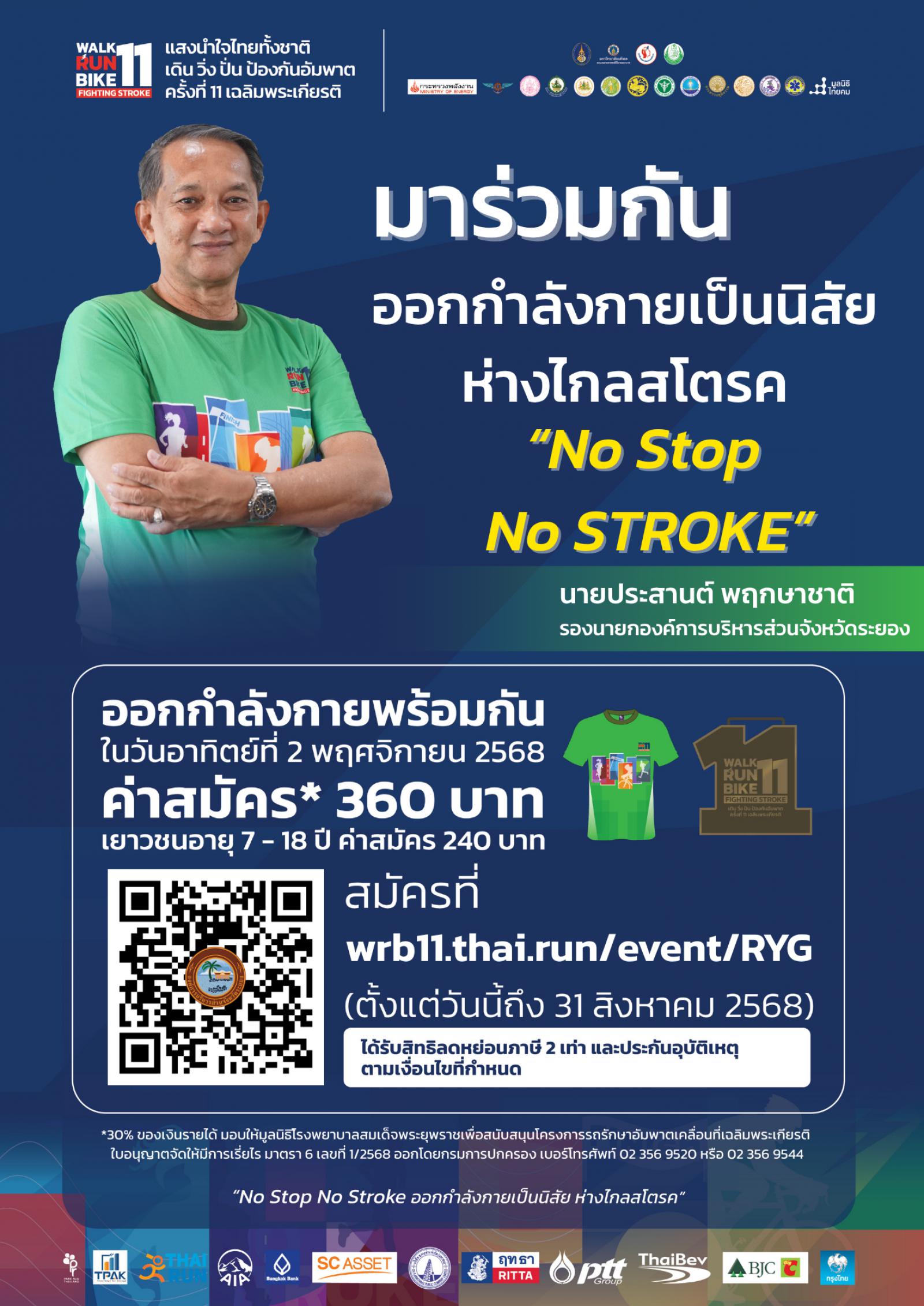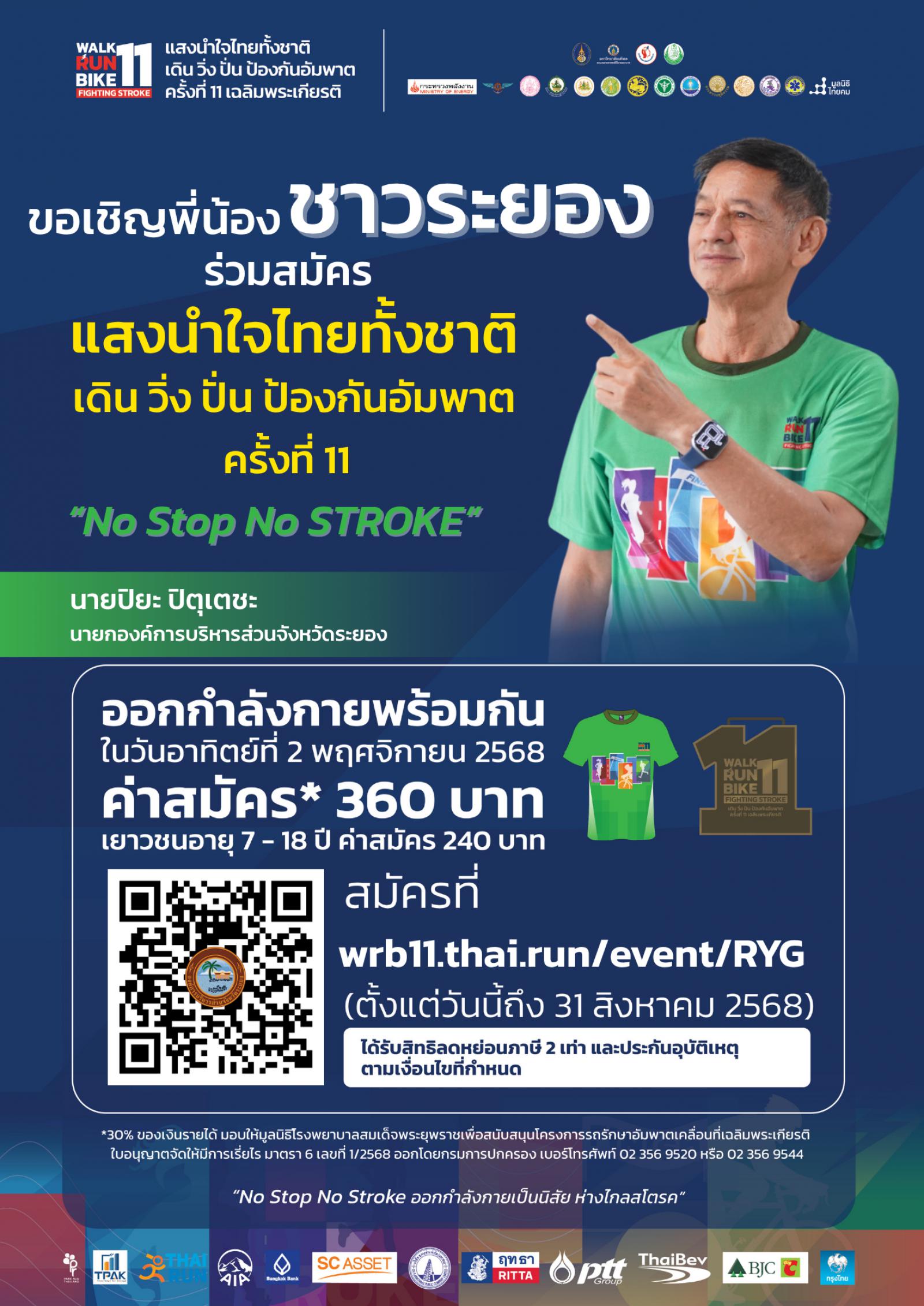 ด้วยจังหวัดระยอง มีหนังสือ ด่วนที่สุด ที่ รย ๐๐๓๓/๑๕๐๓๒ ลงวันที่ ๒๕ กรกฎาคม ๒๕๖๘ แจ้งว่า คณะแพทยศาสตร์ศิริราชพยาบาล มหาวิทยาลัยมหิดล นำโดยศูนย์โรคหลอดเลือดสมองศิริราช ร่วมกับศิริราชมูลนิธิ ได้มีการจัดโครงการแสงนำใจไทยทั้งชาติ เดิน วิ่ง ปั่น ป้องกันอัมพาต ครั้งที่ ๑๑ เฉลิมพระเกียรติ หัวข้อ ออกกำลังเป็นนิสัย ห่างไกลสโตรค (No Stop No STROKE) โดยมีวัตถุประสงค์เพื่อเฉลิมพระเกียรติพระบาทสมเด็จพระเจ้าอยู่หัว และสมเด็จพระนางเจ้าฯ พระบรมราชินี ที่ทรงเป็นดั่งแสงนำใจ และทรงเป็นแบบอย่างแก่ประชาชนชาวไทยในการรักษาสุขภาพและการออกกำลังกายเพื่อสร้างการตระหนักรู้เรื่องโรคหลอดเลือดสมองตลอดจนรณรงค์เชิญชวนคนไทยหันมาออกกำลังกายเพื่อสุขภาพที่แข็งแรงโดยกำหนดให้มีการดำเนินกิจกรรม ๓ กิจกรรม ประกอบด้วย กิจกรรมเฉลิมพระเกียรติ กิจกรรมให้ความรู้โรคหลอดเลือดสมอง และกิจกรรมออกกำลังกายเดิน วิ่ง ปั่น ป้องกันอัมพาต กำหนดจัดกิจกรรมระหว่างวันที่ ๒๗ ตุลาคม - ๒ พฤศจิกายน ๒๕๖๘ สำนักงานสาธารณสุขจังหวัด