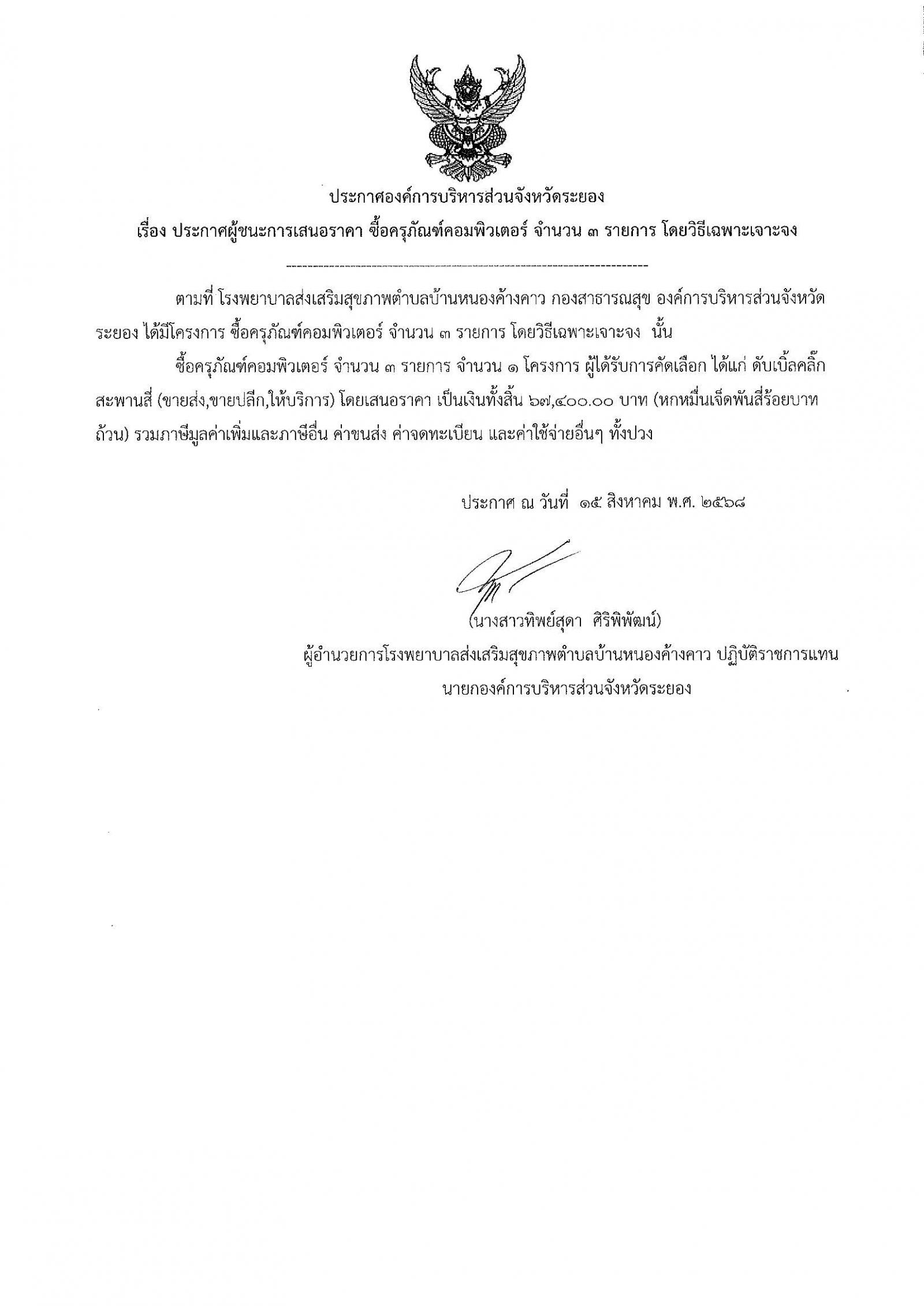 📌ประกาศผู้ชนะการเสนอราีคา จ้างเหมาจัดทำทำเนียบองค์การบริหารส่วนจัหวัดระยอง