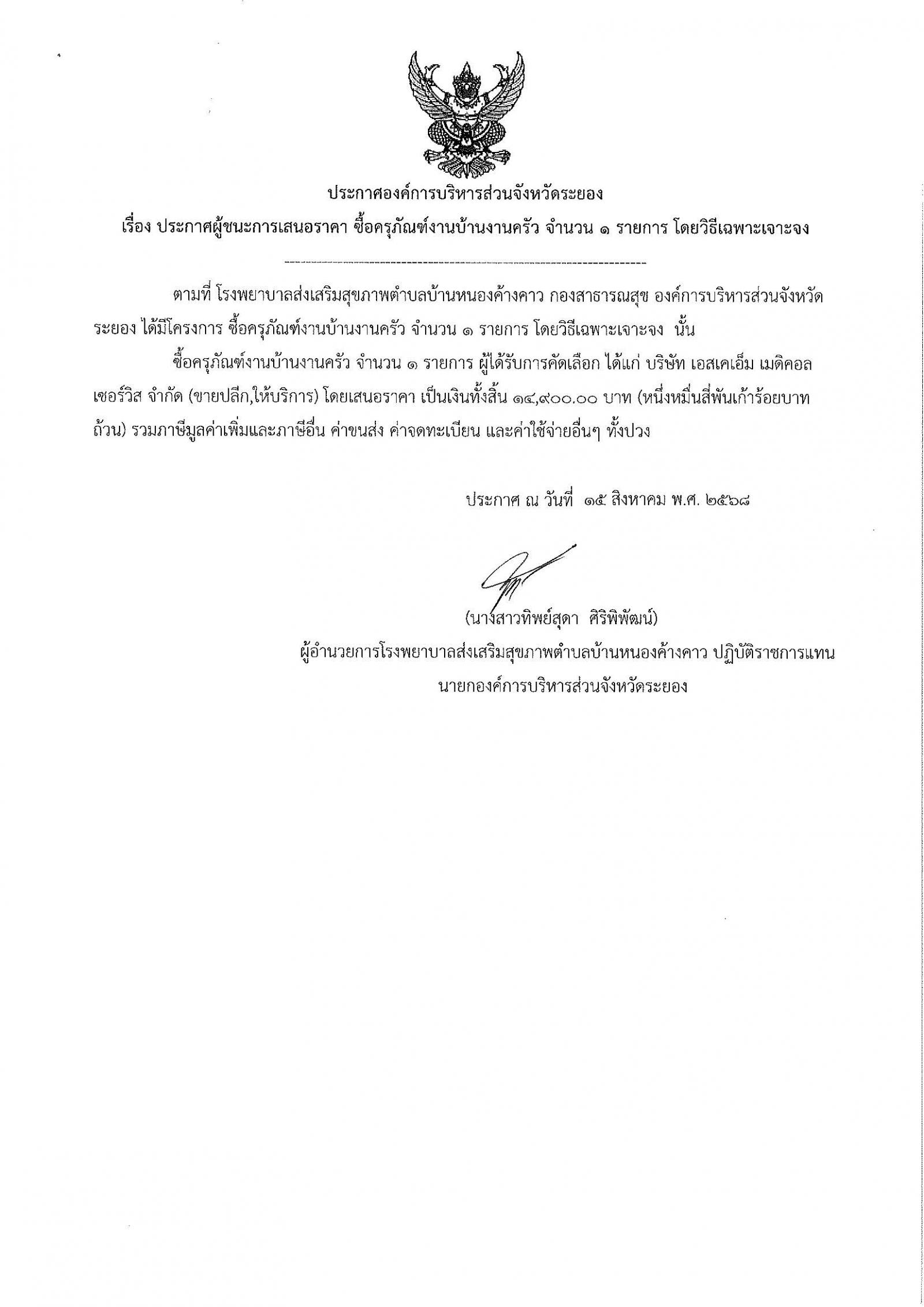📌ประกาศผู้ชนะการเสนอราีคา จ้างเหมาจัดทำทำเนียบองค์การบริหารส่วนจัหวัดระยอง
