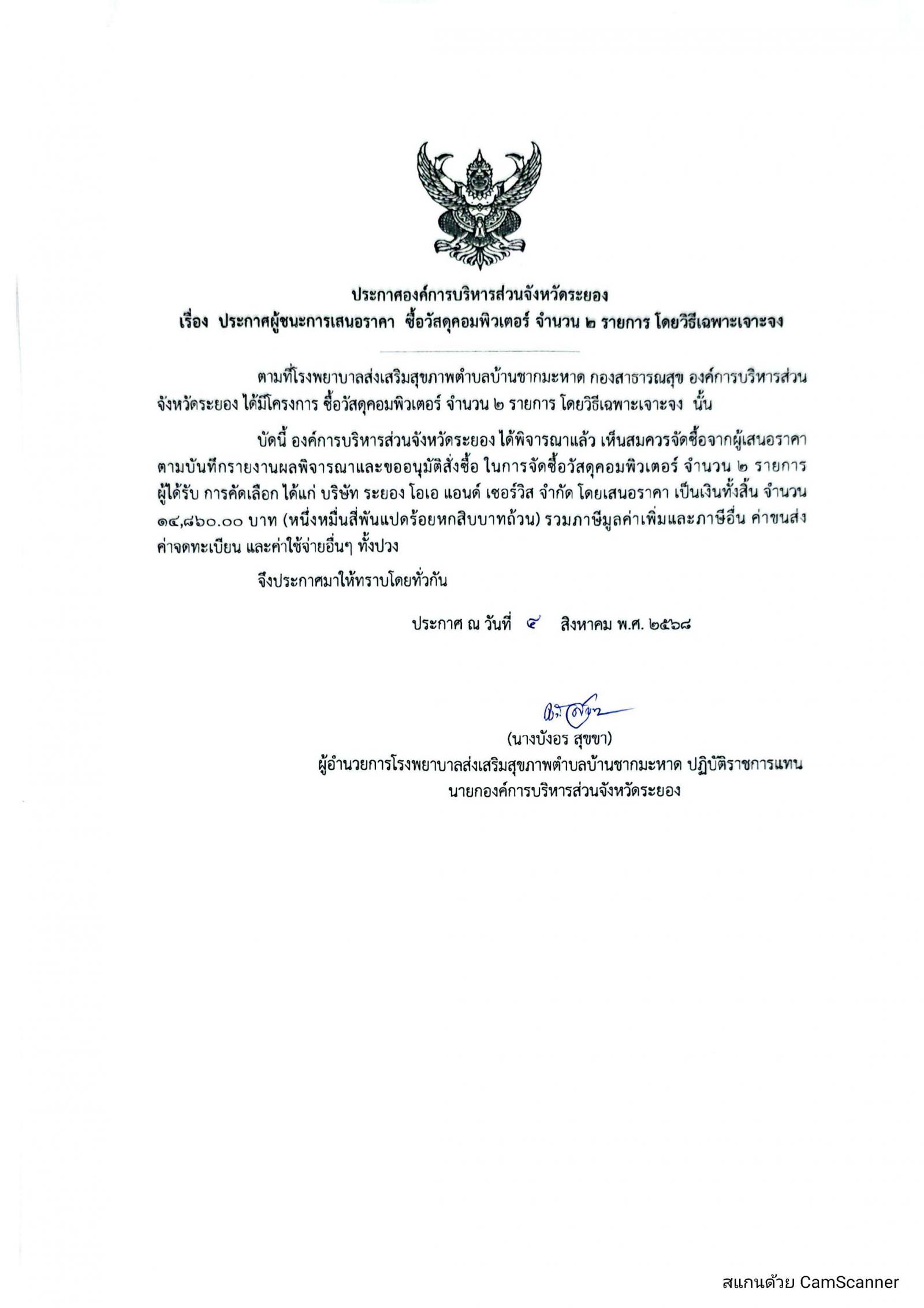 📌ประกาศผู้ชนะการเสนอราีคา จ้างเหมาจัดทำทำเนียบองค์การบริหารส่วนจัหวัดระยอง
