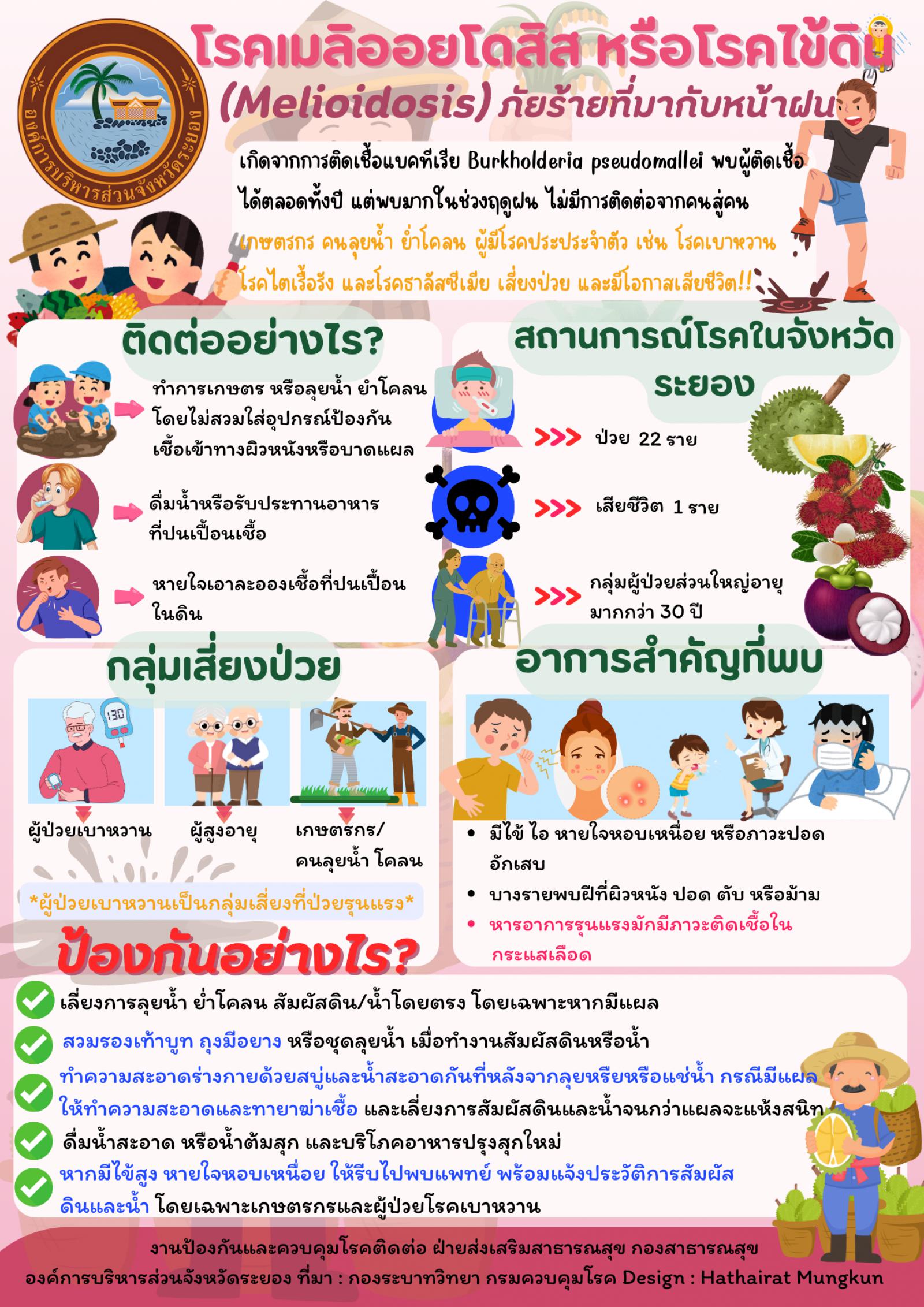 ด้วยสถานการณ์โรคเมลิออยด์ในประเทศไทย ตั้งแต่วันที่ ๑ มกราคม ๒๕๖๘ - ๓๐ มิถุนายน ๒๕๖๘ พบผู้ป่วยโรคเมลิออย์ จำนวน ๑,๕๕๔ ราย มีผู้เสียชีวิต จำนวน ๖๓ ราย โดยสถานการณ์โรคเมลิออยด์ในเขตสุขภาพที่ ๖ พบผู้ป่วย จำนวน ๘๙ ราย มีผู้เสียชีวิต จำนวน ๑ ราย (ที่มา: สำนักงานป้องกันควบคุมโรคที่ ๖ จังหวัดชลบุรี) ซึ่งสถานการณ์โรคเมลิออยด์ในจังหวัดระยอง ข้อมูลระหว่างวันที่ ๑ มกราคม ๒๕๖๘ - ๒๐ สิงหาคม ๒๕๖๘ พบผู้ป่วย จำนวน ๒๒ ราย มีผู้เสียชีวิต จำนวน ๑ ราย กลุ่มอายุที่พบผู้ป่วยสูงที่สุด คือ อายุ ๕๐ - ๕๕ ปี (ที่มา: รายงาน D๕๐๖ กองระบาดวิทยา กรมควบคุมโรค) รายละเอียดปรากฏตามเอกสารที่แนบมาพร้อมนี้