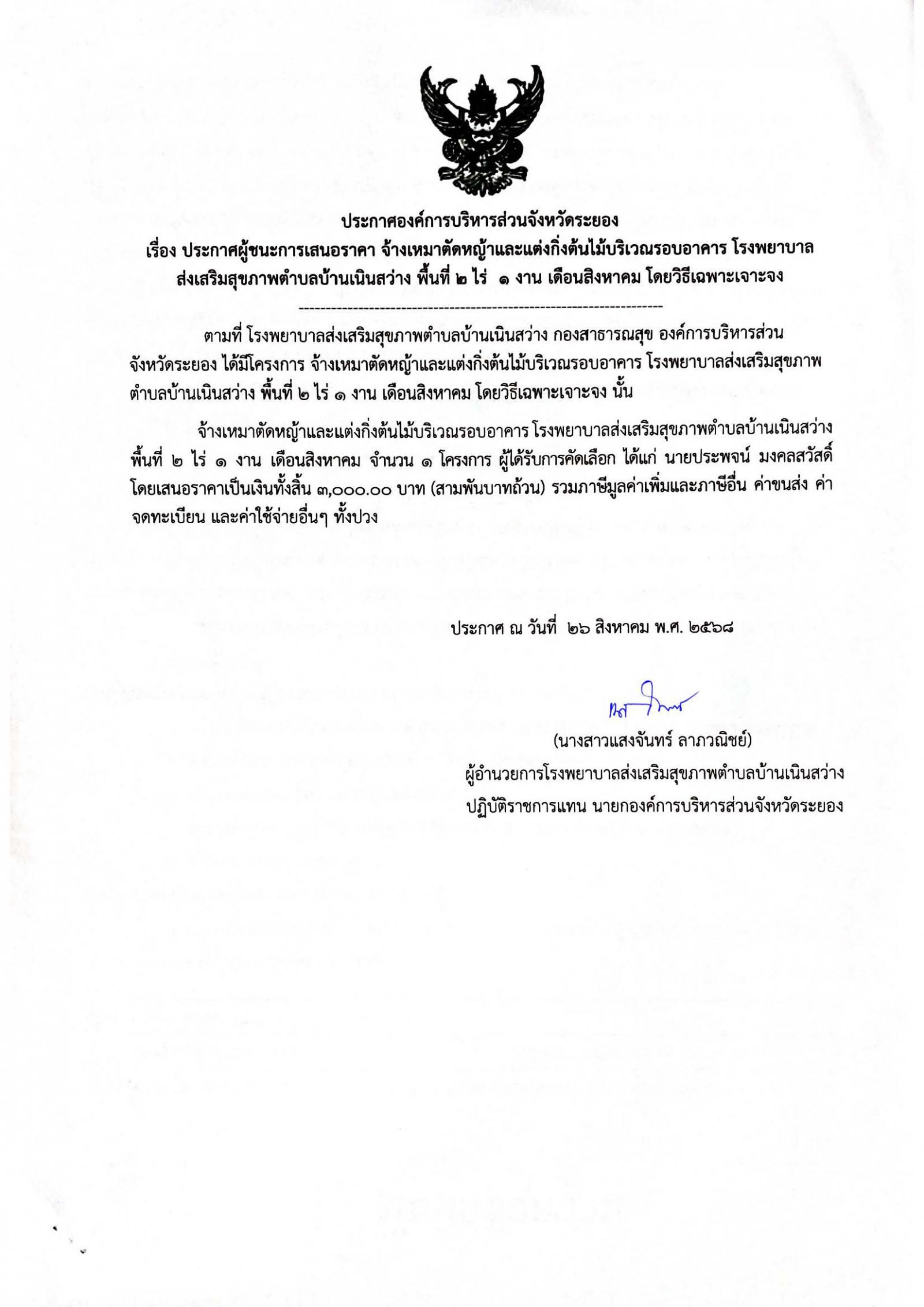 ประกาศผู้ชนะการเสนอราคา จ้างเหมาตัดหญ้าและแต่งกิ่งต้นไม้บริเวณรอบอาคาร โรงพยาบาลส่งเสริมสุขภาพตำบลบ้านเนินสว่าง พื้นที่ 2 ไร่ 1 งาน เดือนสิงหาคม โดยวิธีเฉพาะเจาะจง