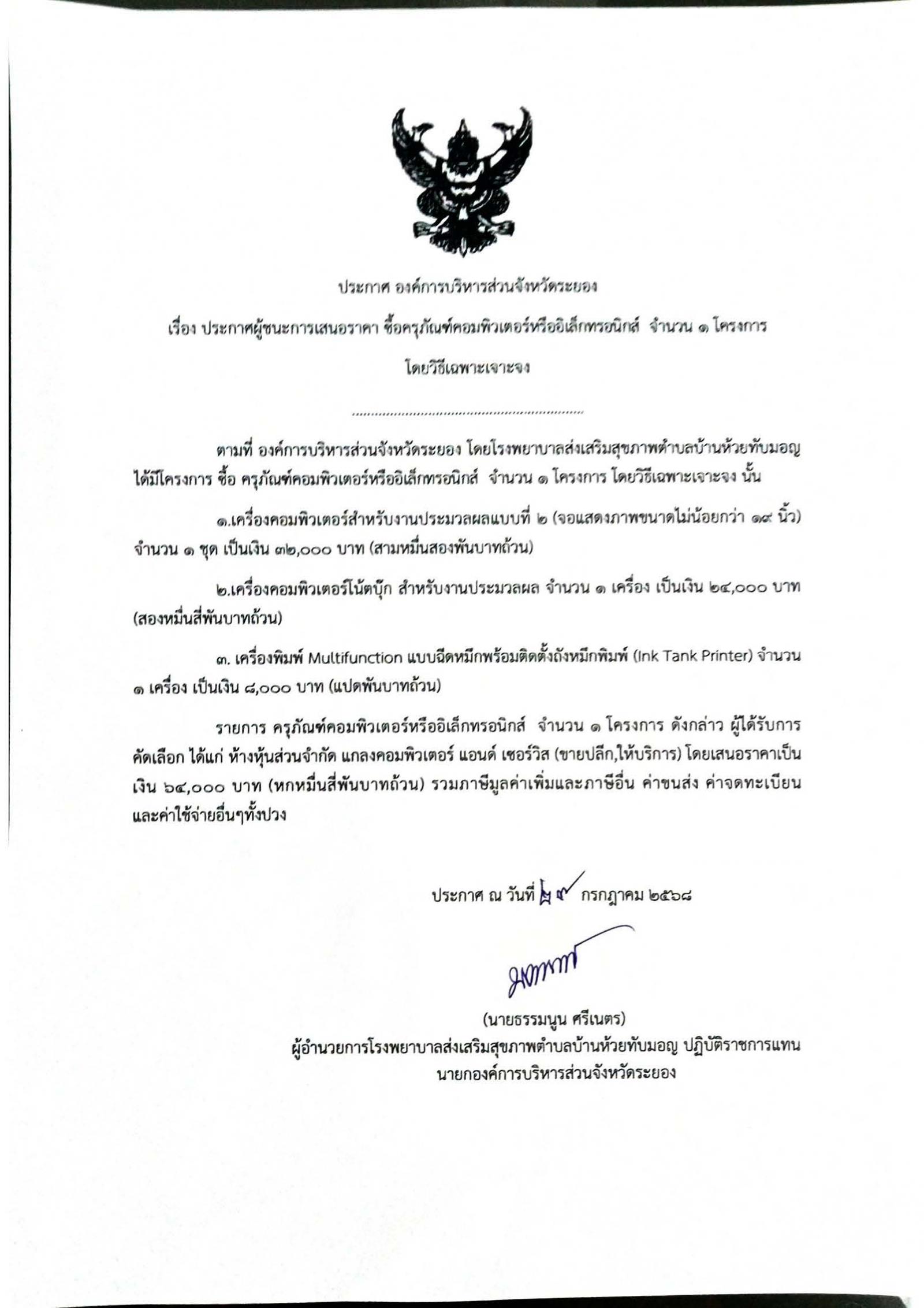 📌ประกาศผู้ชนะการเสนอราีคา จ้างเหมาจัดทำทำเนียบองค์การบริหารส่วนจัหวัดระยอง