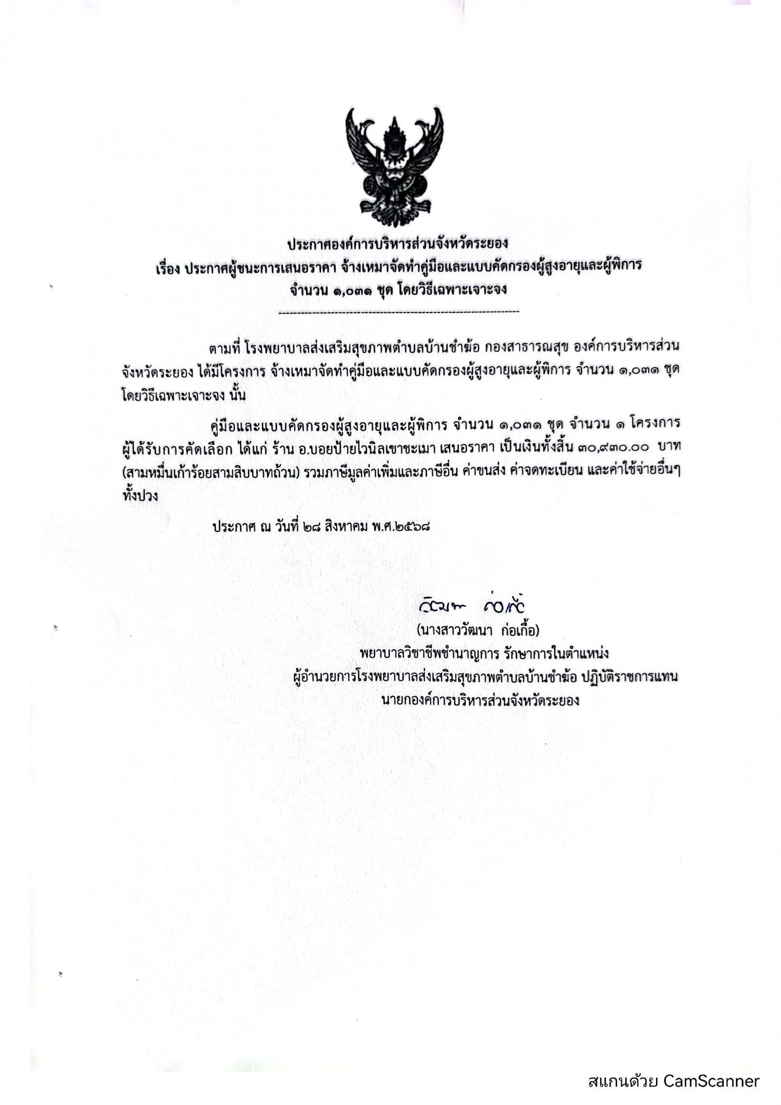 ประกาศผู้ชนะการเสนอราคา จ้างเหมาจัดทำคู่มือและแบบคัดกรองผู้สูงอายุและผู้พิการ จำนวน 1,031 ชุด โดยวิธีเฉพาะเจาะจง