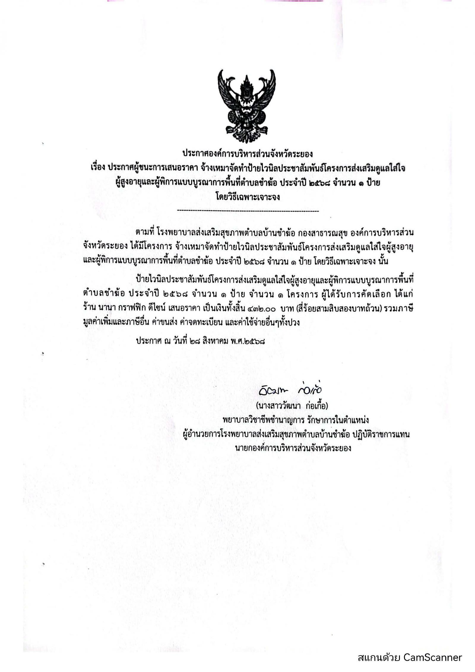 📌ประกาศผู้ชนะการเสนอราีคา จ้างเหมาจัดทำทำเนียบองค์การบริหารส่วนจัหวัดระยอง