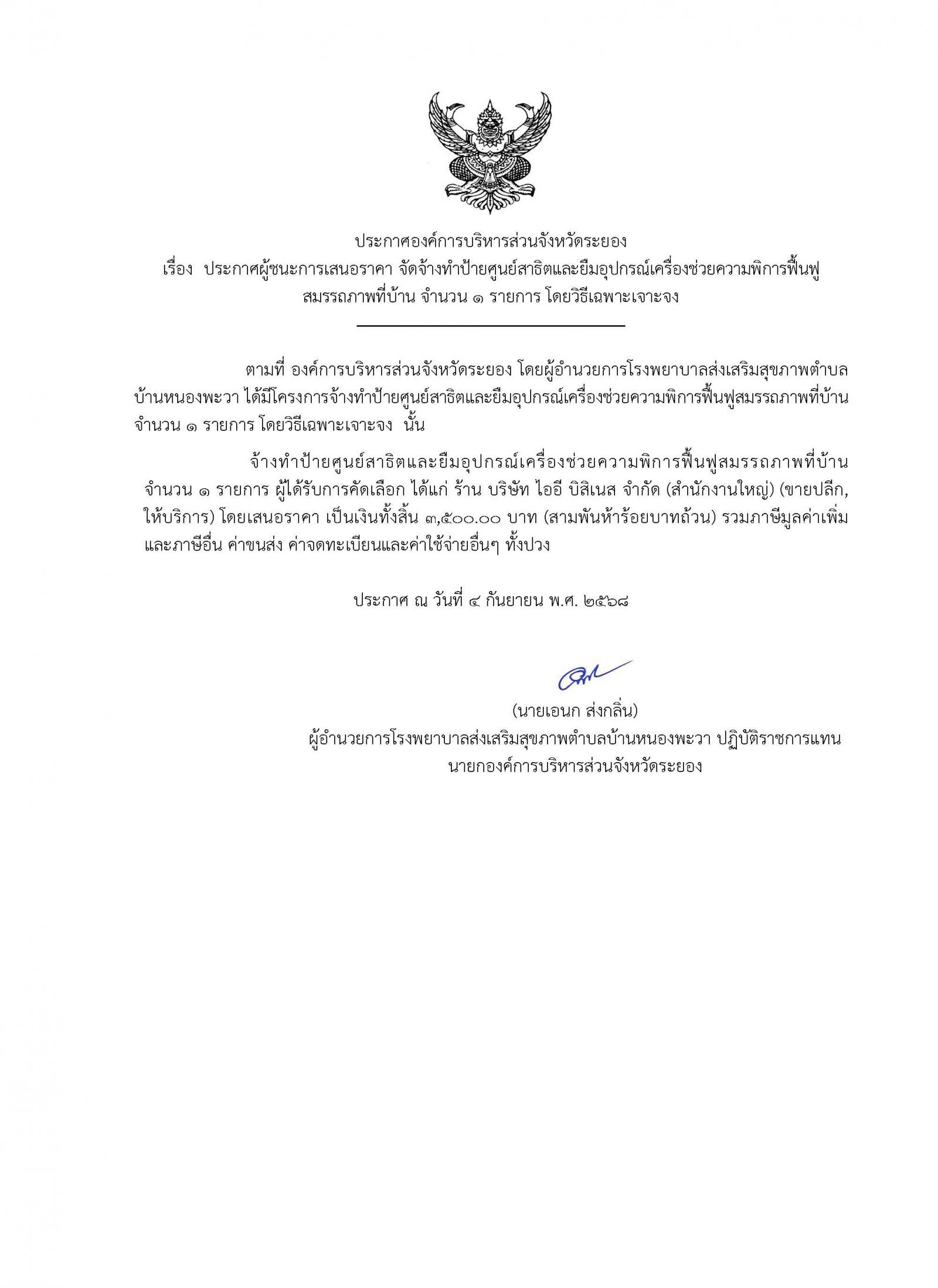 📌ประกาศผู้ชนะการเสนอราีคา จ้างเหมาจัดทำทำเนียบองค์การบริหารส่วนจัหวัดระยอง
