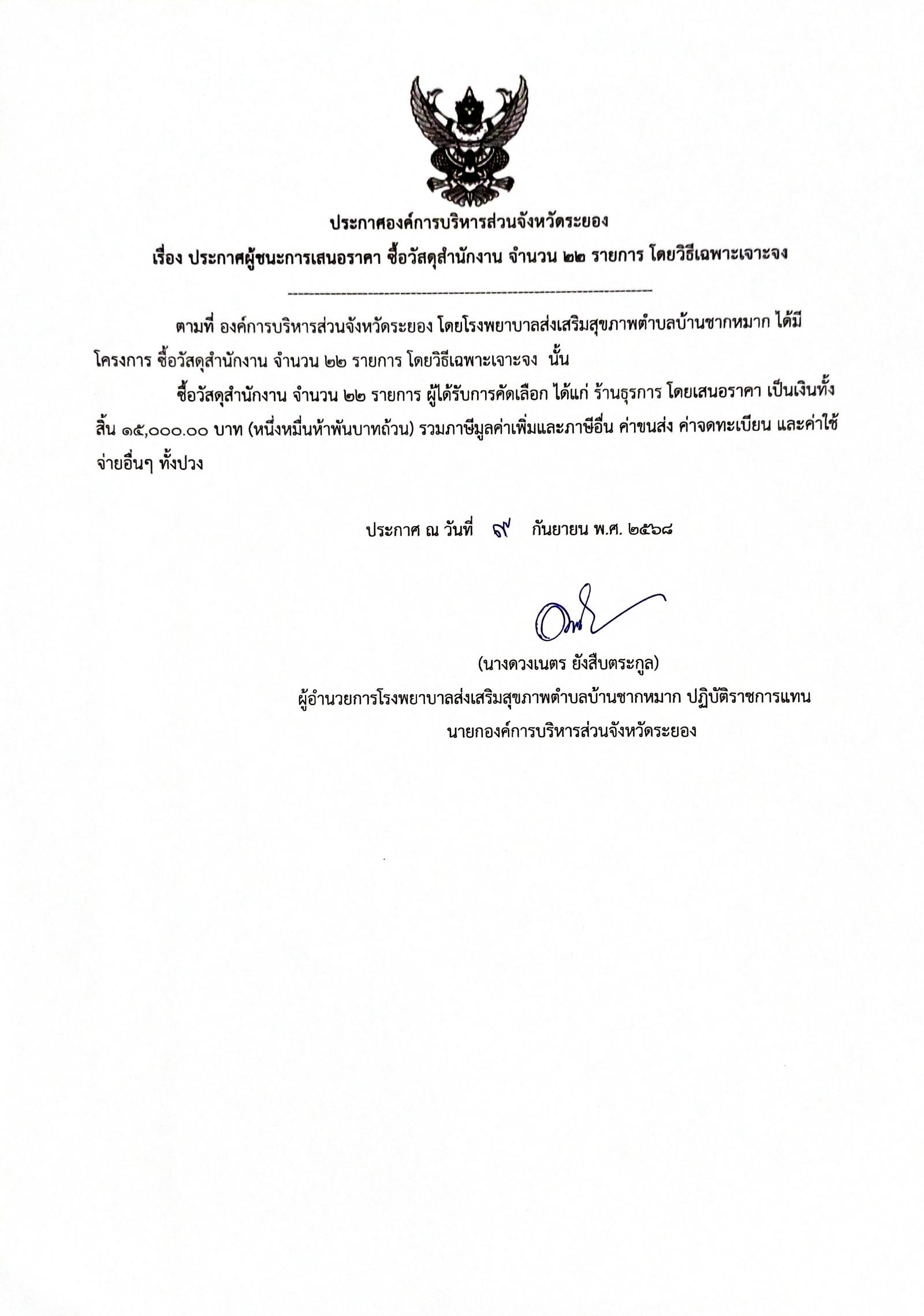 ประกาศผู้ชนะการเสนอราคา ซื้อวัสดุสำนักงาน จำนวน 22 รายการ โดยวิธีเฉพาะเจาะจง